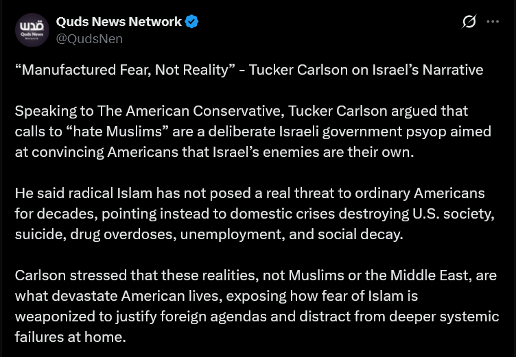 “Manufactured Fear, Not Reality” - Tucker Carlson on Israel’s Narrative Speaking to The American Conservative, Tucker Carlson argued that calls to “hate Muslims” are a deliberate Israeli government psyop aimed at convincing Americans that Israel’s enemies are their own. He said radical Islam has not posed a real threat to ordinary Americans for decades, pointing instead to domestic crises destroying U.S. society, suicide, drug overdoses, unemployment, and social decay. Carlson stressed that these realities, not Muslims or the Middle East, are what devastate American lives, exposing how fear of Islam is weaponized to justify foreign agendas and distract from deeper systemic failures at home.