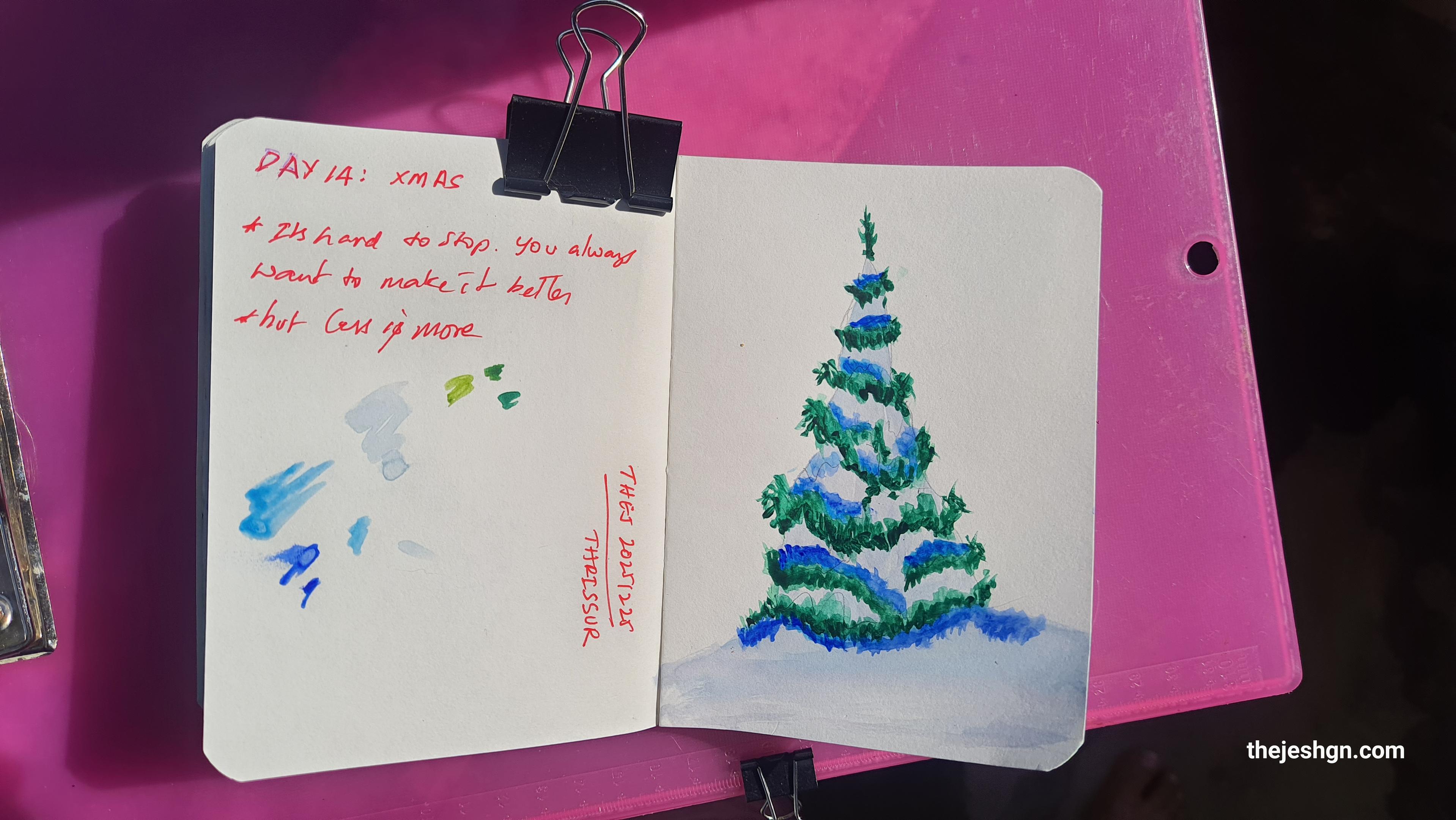 @thej An open sketchbook lies on a pink surface, secured by two black paper clips. The left page features handwritten red text: "DAY 14: XMAS", "It's hard to stop. You always want to make it better but less is more", blue and green watercolor smudges, and the word "THRESHOLD" in red with a line beneath it. The right page displays a watercolor painting of a Christmas tree with green branches, blue and white snow accents, and a white base. A small black hole is visible on the pink surface to the right of the sketchbook. The text "thejeshgn.com" appears in the bottom right corner of the image.