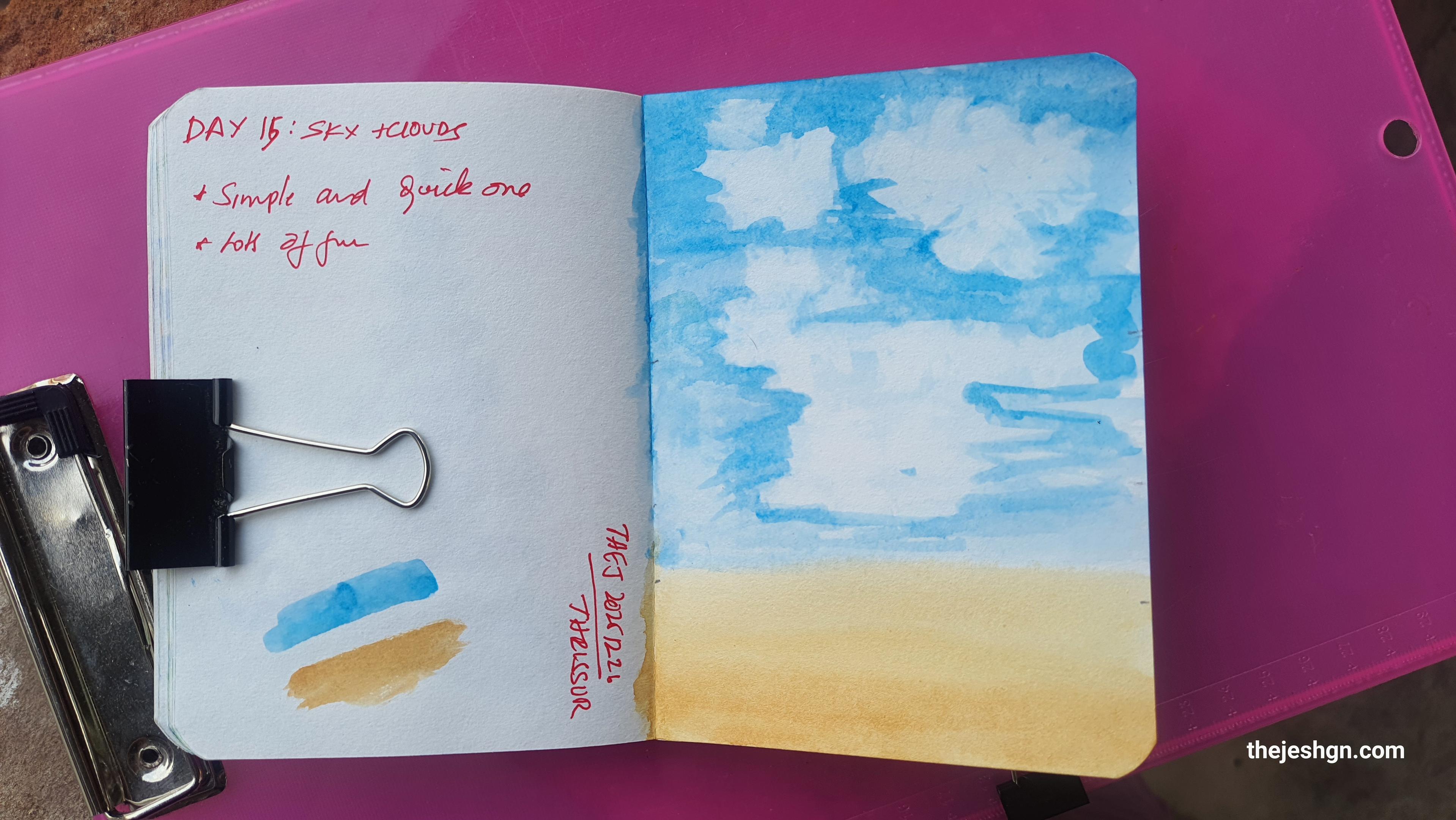 @thej An open notebook rests on a pink surface, with the left page displaying handwritten red text, watercolor swatches, and a black binder clip, while the right page features a watercolor painting of a sky with clouds above a sandy area. The left page has text reading: “DAY 15: SKY CLOUDS”, “+ Simple and quick one”, “+ took a few”, “thejeshgn.com”, “TAS 3/2021”, and “TREASURE” (the last two words written vertically). Three horizontal watercolor swatches (light blue, darker blue, yellow) are also on the left page. The right page shows a blue sky with white clouds above a yellow base. A black binder clip secures the pages, and a metal clip is partially visible on the left edge of the notebook.