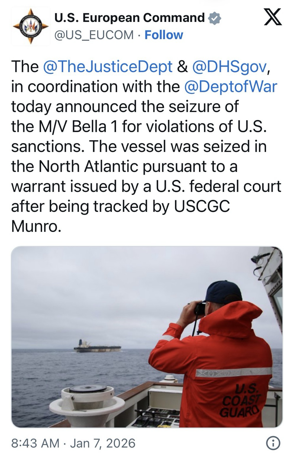 #Russia hasn’t commented on the apparent #US operation against the Russian-flagged #OilTanker. In a statement issued on Tuesday to the state news agency #Tass, the Russian Foreign Ministry said the vessel was operating in full compliance with international #MaritimeLaw, & said it was receiving increased attention from the US & #NATO “disproportionate to its peaceful status.”