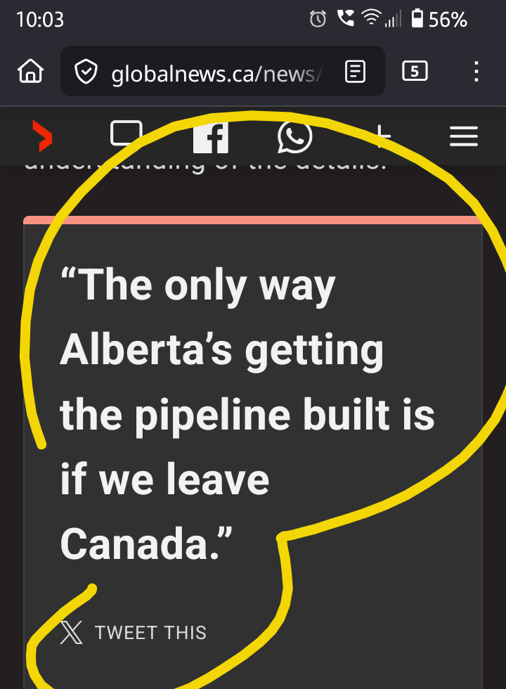 Anti Canada Political Action built -in to Global News article on Carney's pipeline. Like an ad, but part of the story, like an ad but it puts the anti Canada message on Musks weapon.