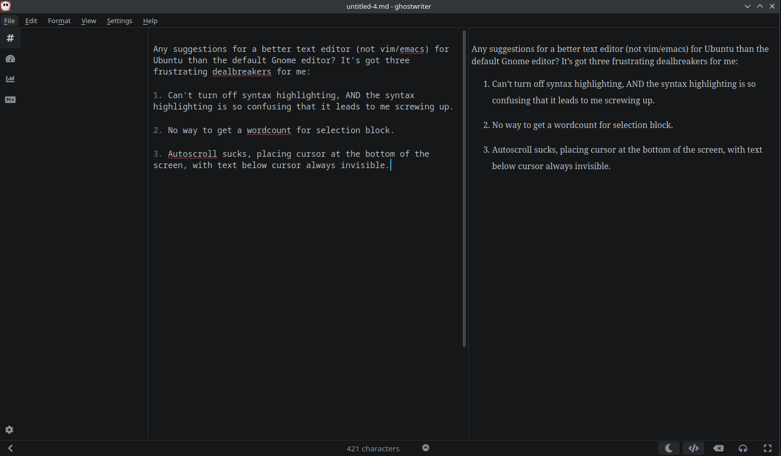 White screen with black text that reads: Any suggestions for a better text editor (not vim/emacs) for Ubuntu than the default Gnome editor? It's got three frustrating dealbreakers for me: 1. Can't turn off syntax highlighting, AND the syntax highlighting is so confusing that it leads to me screwing up. 2. No way to get a wordcount for selection block. 3. Autoscroll sucks, placing cursor at the bottom of the screen, with text below cursor always invisible.