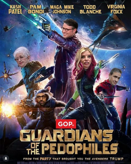 Movie poster for “Guardians Of The Galaxy”, but with movie characters faces replaced by Mike Johnson, Pam Bondi, Kash Patel, Virginia Foxx and Todd Blanche. The movie title is changed to “Guardians Of The Pedophiles”.