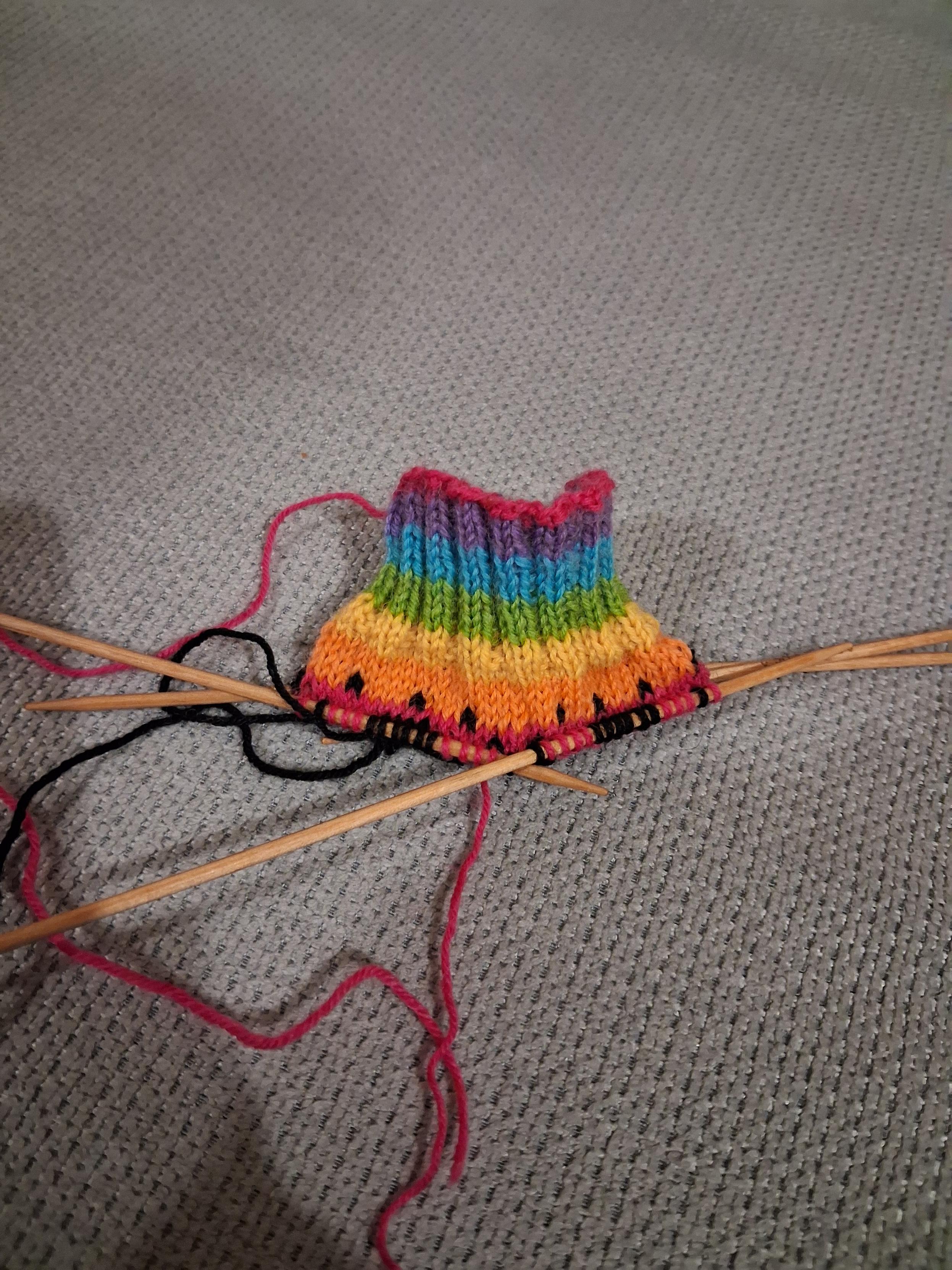 L'arrière d’une chaussette en cours de tricot. Le fond est fait de bandes de couleur rose, violette, bleu, verte, jaune et orange. Un damier noir et coloré fait les trois quart de la hauteur de la chaussette.