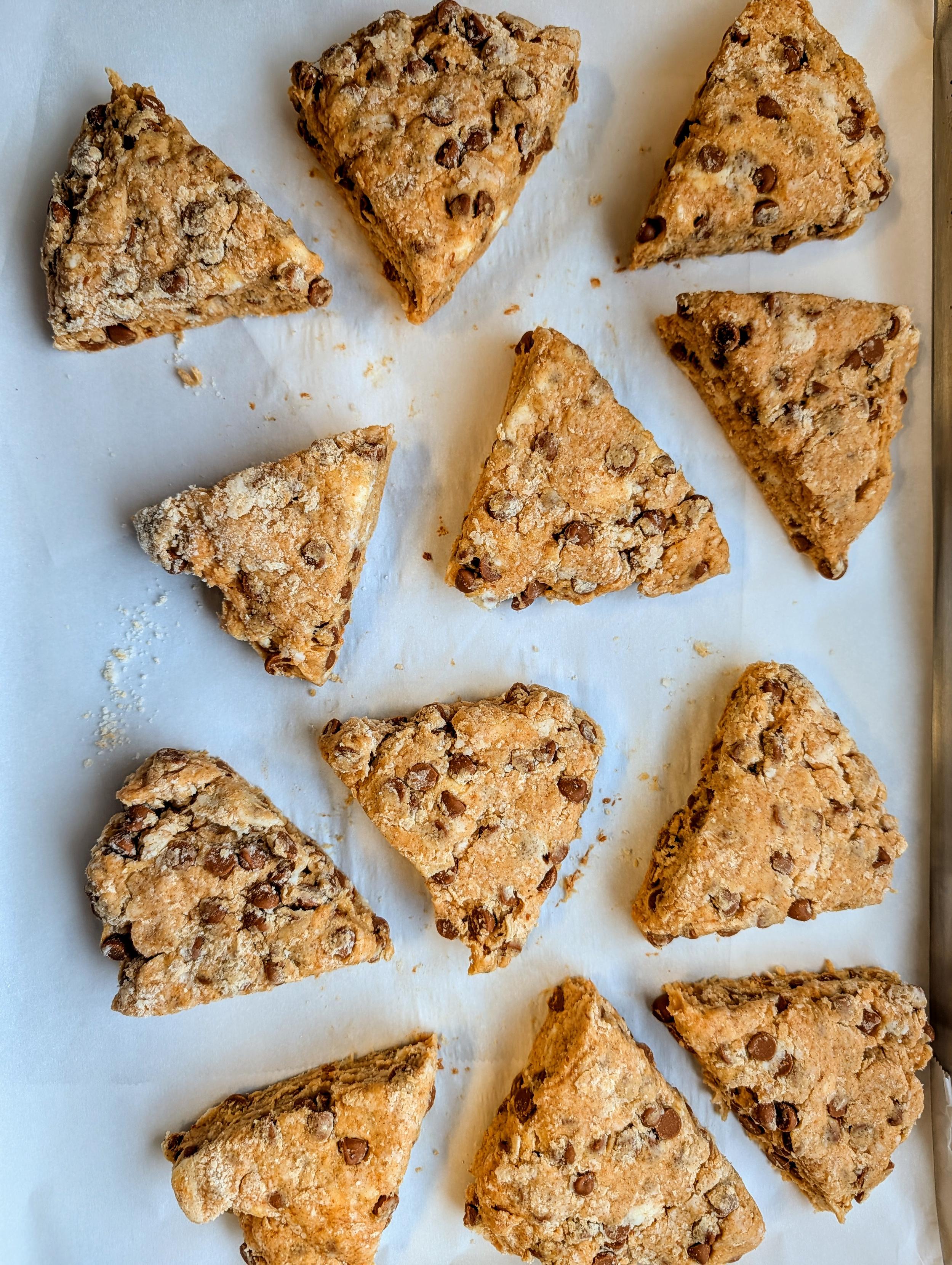 Pumpkin cinnamon chip scones are cooling on a wire rack.