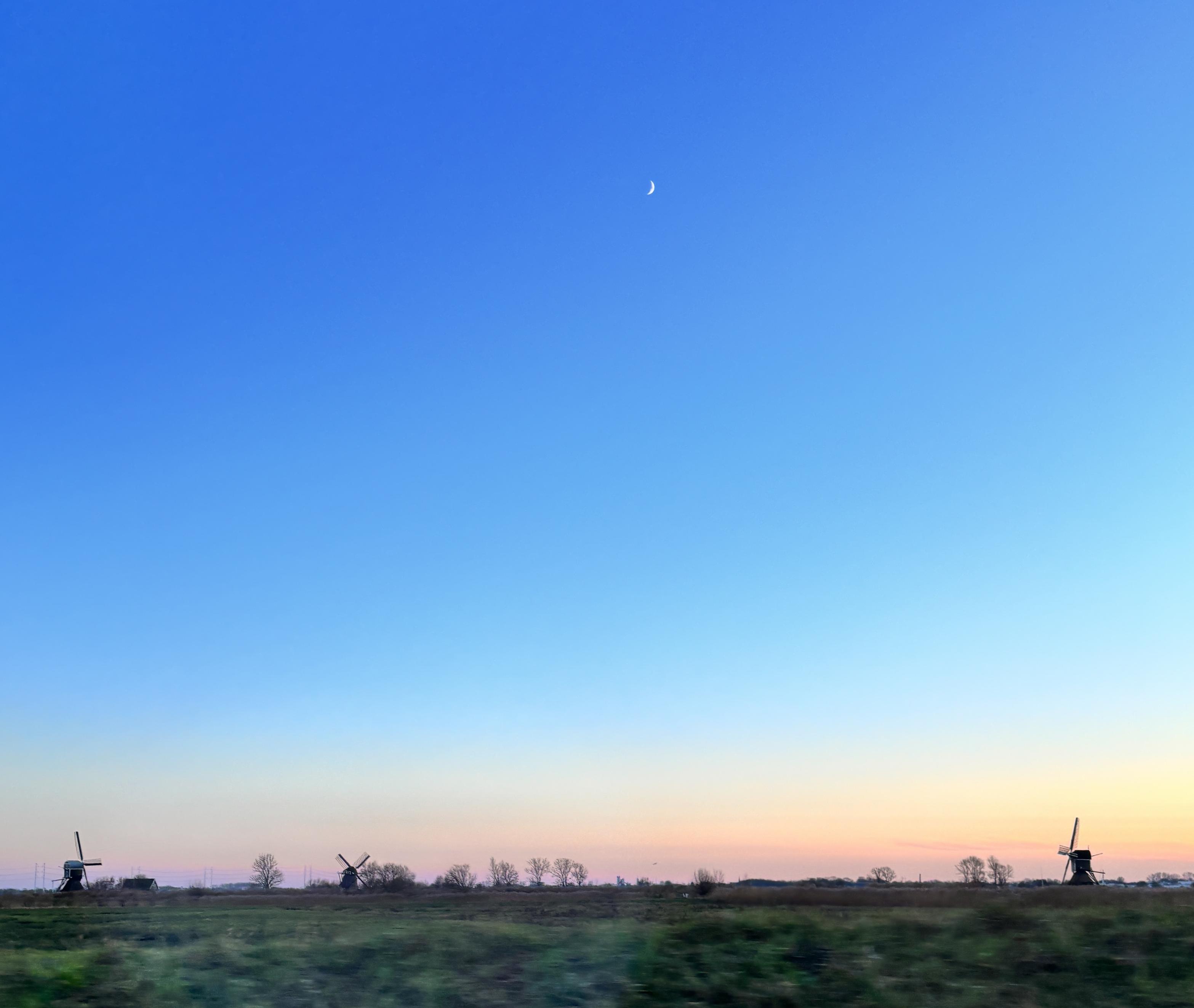 Three windmills and the moon #PhotosFromTheRoad #sunset
