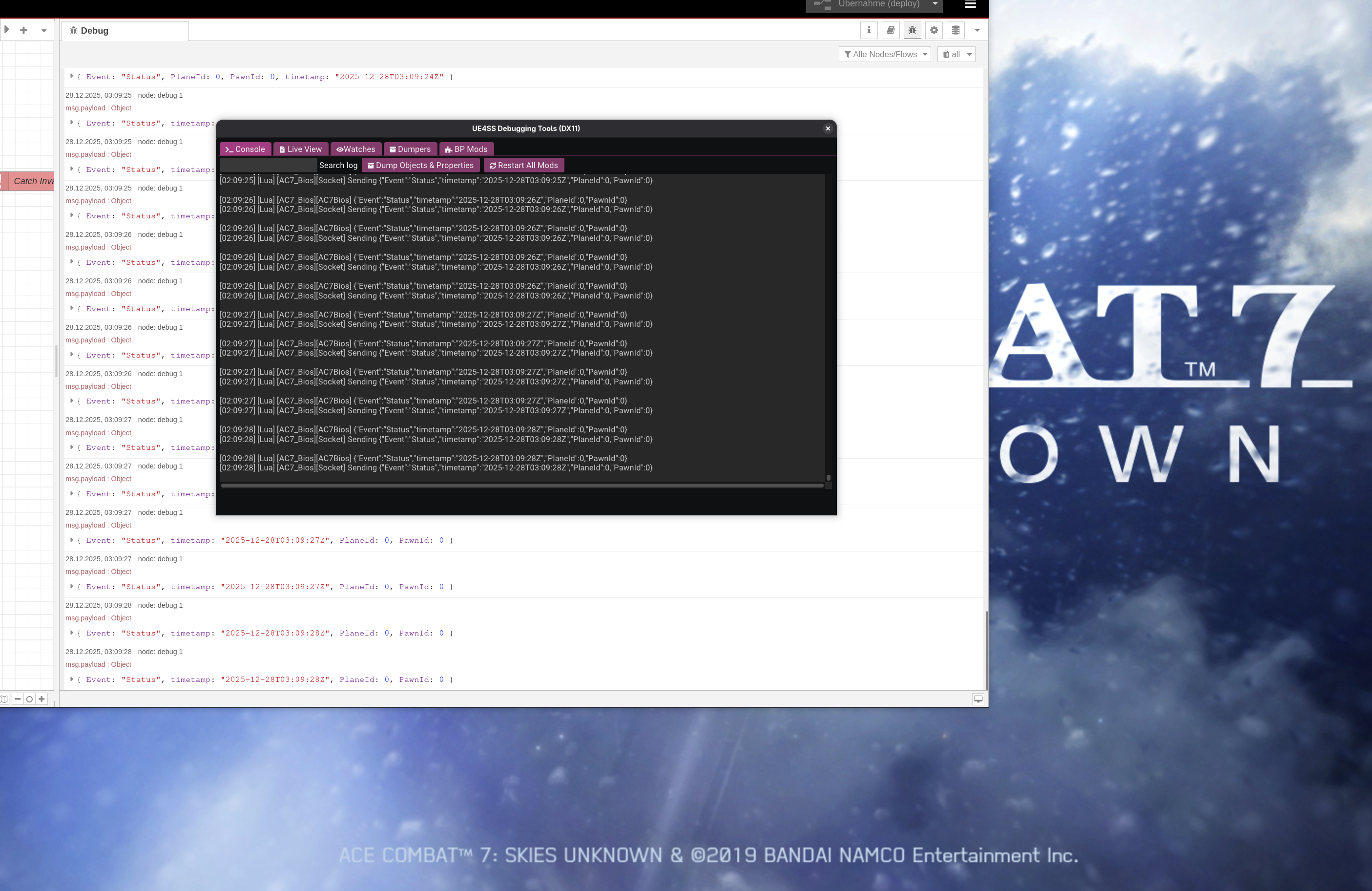More proof of concept for #AceCombat7. I found some pre-compiled #luaSocket lib (could not for my life generate a static cross compiled version using mingw) and managed to sideload it with UE4SS where I can now raise a UDP (or TCP) socket and rapid fire a demo event with a timestamp.