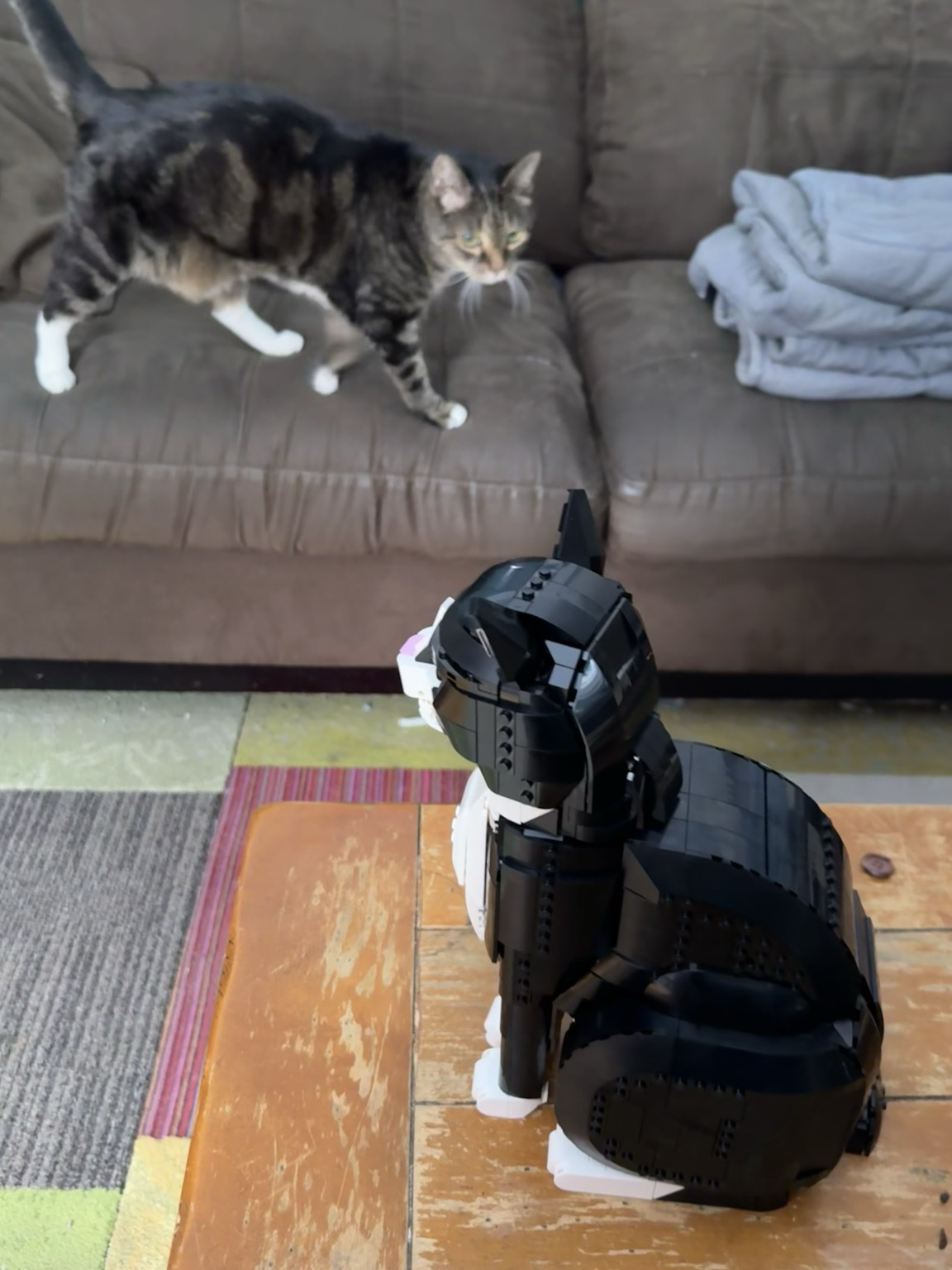 my parents got us a Lego tuxedo cat to build over Christmas. We decided to introduce it to Pica today. #picathecat #lego #legocat #catsofmastodon #cats
