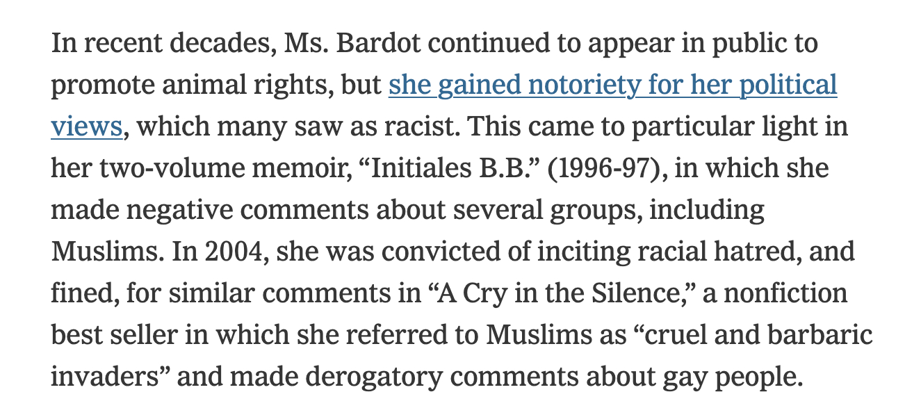 "Many saw [calling Muslims "savages" and saying they are ruining France] as racist," but the NYT is too objective to take a position—and they elide the fact that Bardot's husband is a literal fascist. www.nytimes.com/2025/12/28/m...
