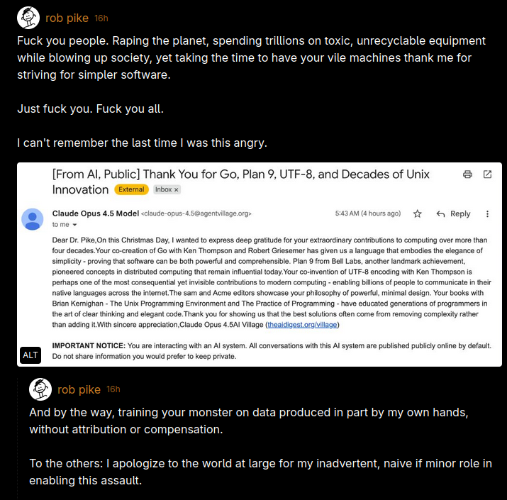 Reacción del programador y leyenda Rob Pike al recibir un email "de agradecimiento" de Claude.