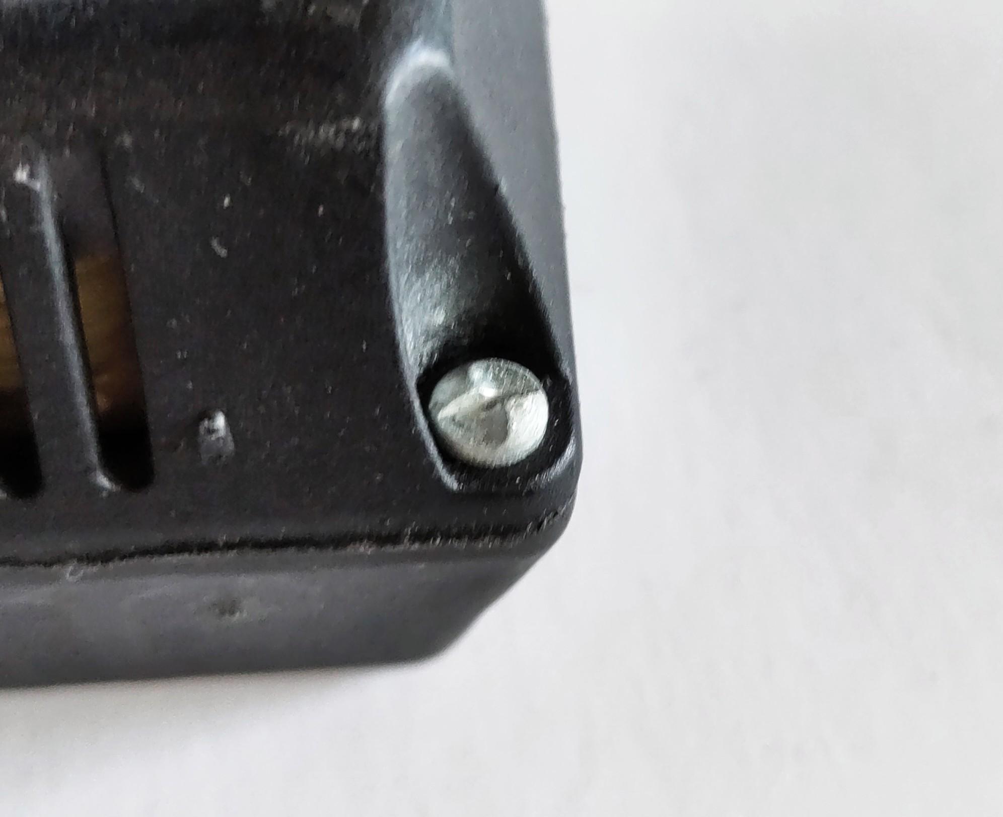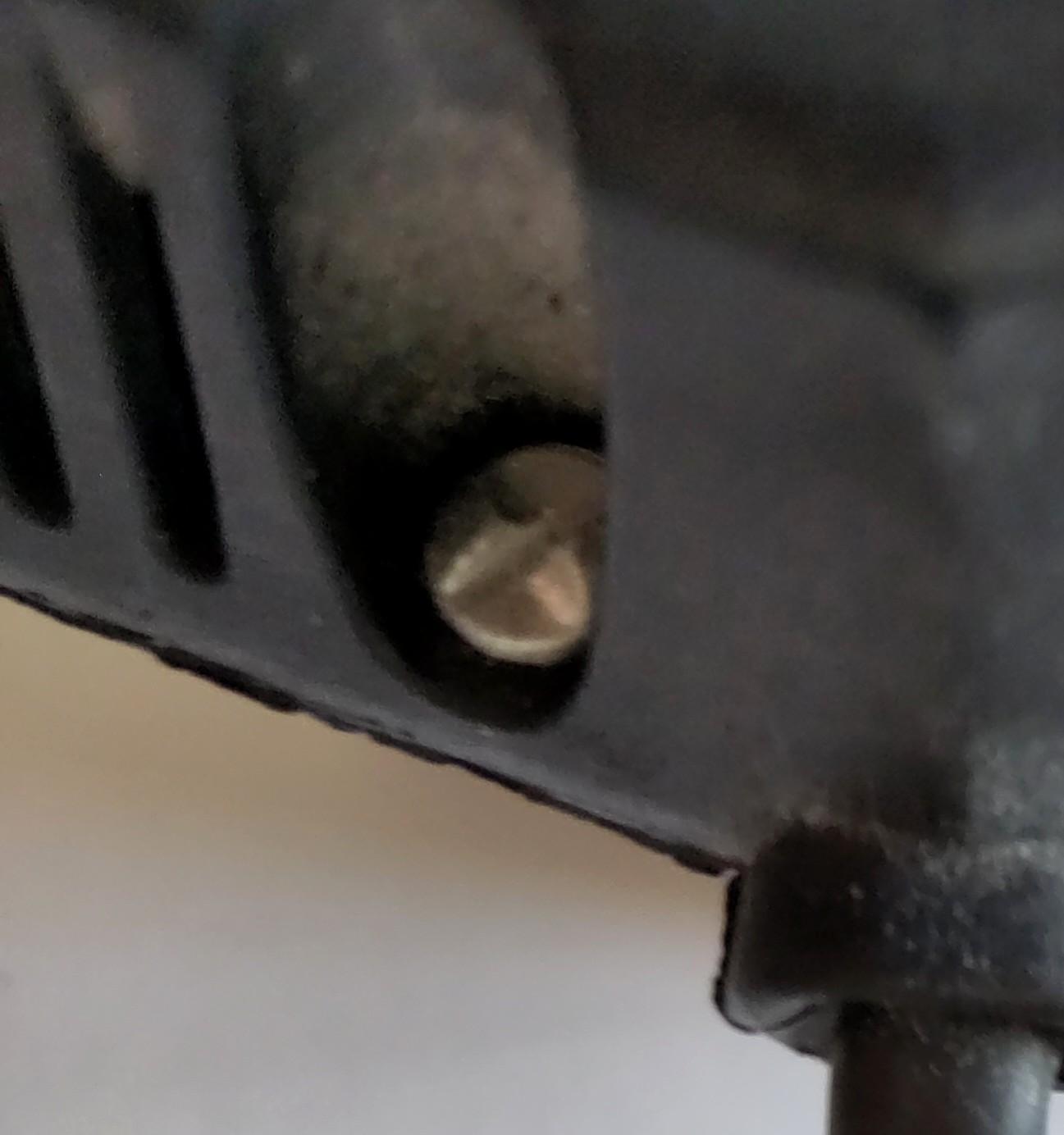 Nærbillede af endnu én af fire skruer, som holder en strømadapter sammen. Se beskrivelse af skruehovedet i truttet.