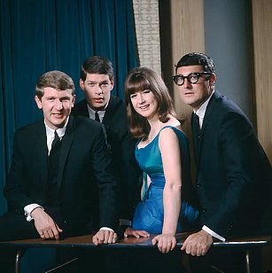 The Seekers. Three men in suits and a woman in a blue dress.