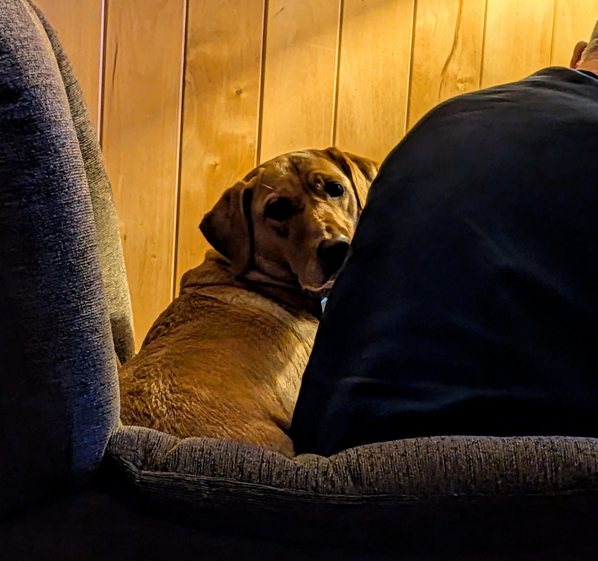 Golden lab is sharing a recliner with her pal. Summer is in the back seat he gets to sit on the front edge. She is looking at me behind his back.