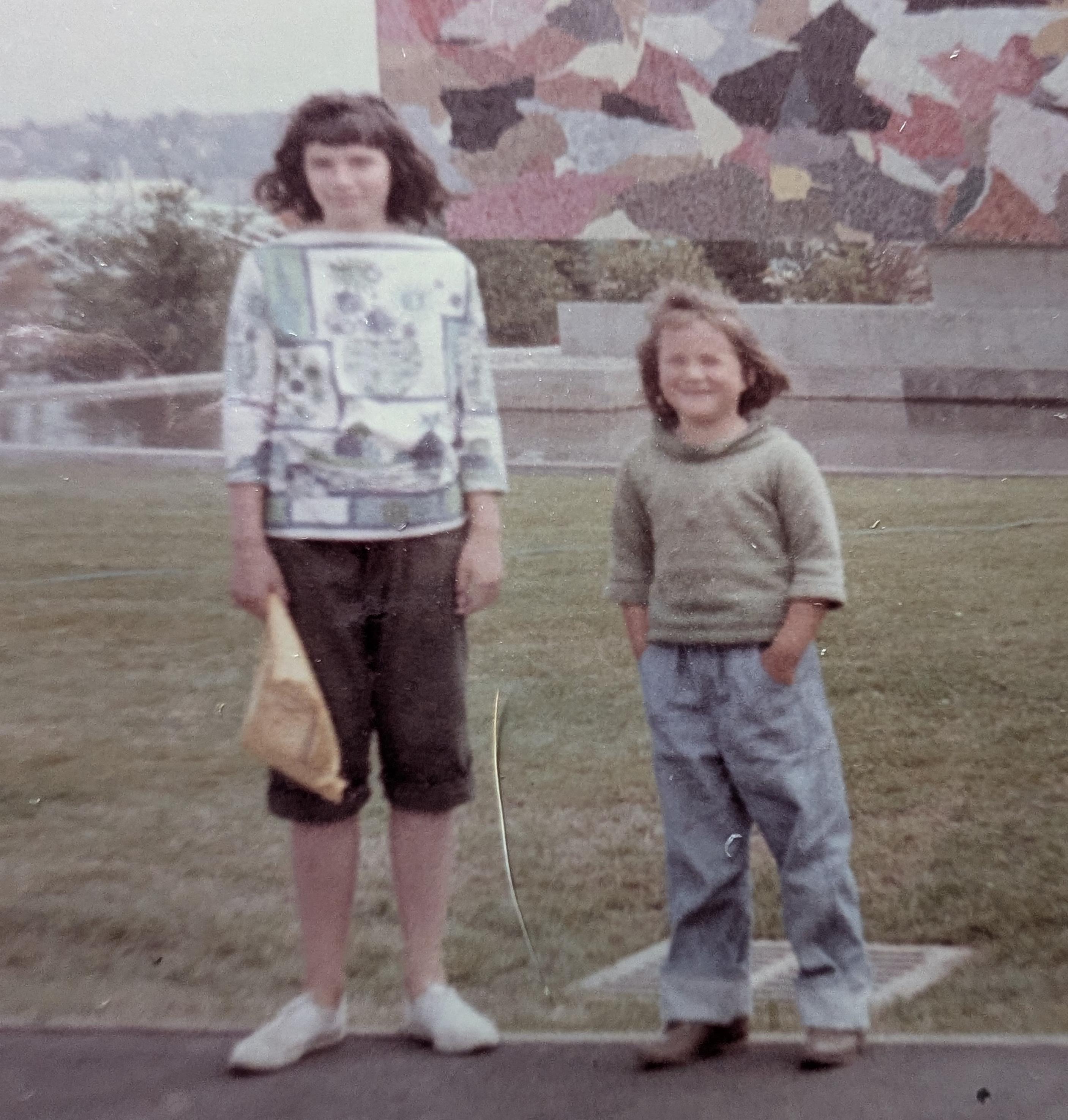 My older sister and I standing near the Space Needle in Seattle in 1964. I am the sassy short one. She has something in her right hand. My hands are in my pockets. I was in the process of refusing to go up to the top of the Space Needle. I did stay on the ground.