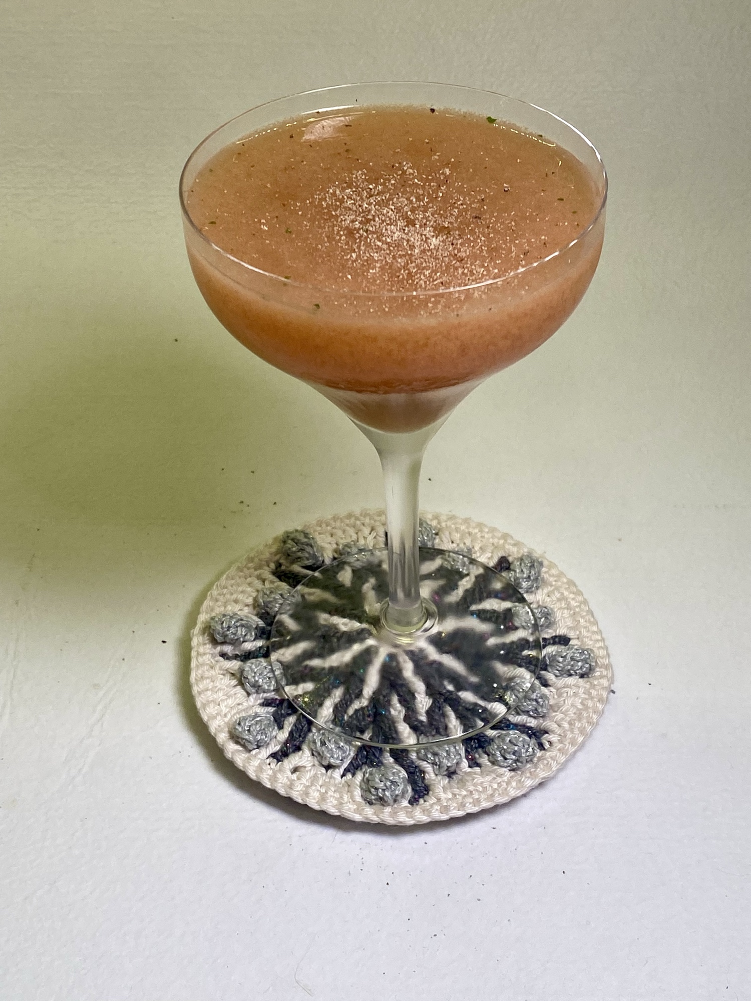 Hola #drinkklubben! Jag har blandat en ”Elixir Tropical”. Tänkte göra av med lite av den orgeat jag gjorde i höstas. Här blev den en aning dominant pga smaklös bassprit, kanske. Likväl god. Och min fru har virkat coasters till mig. Skål 🥂 och god fortsättning >