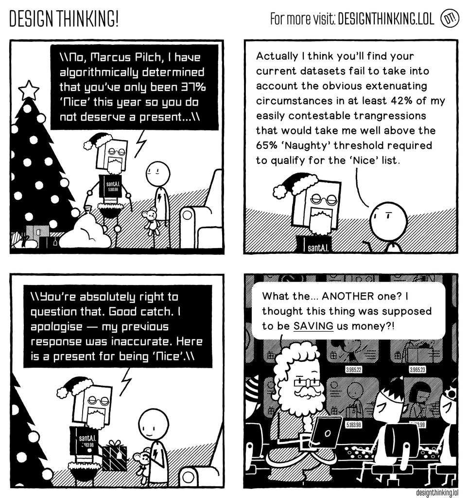 #alttext "four panel comic by Design Thinking! humorously explores the application of data analytics and a human-centered approach to Santa's Naughty and Nice list. Santa-dressed AI robot initially denies a present to Marcus Pilch based on a 37% "Nice" score, but reconsiders after Marcus contests the data.