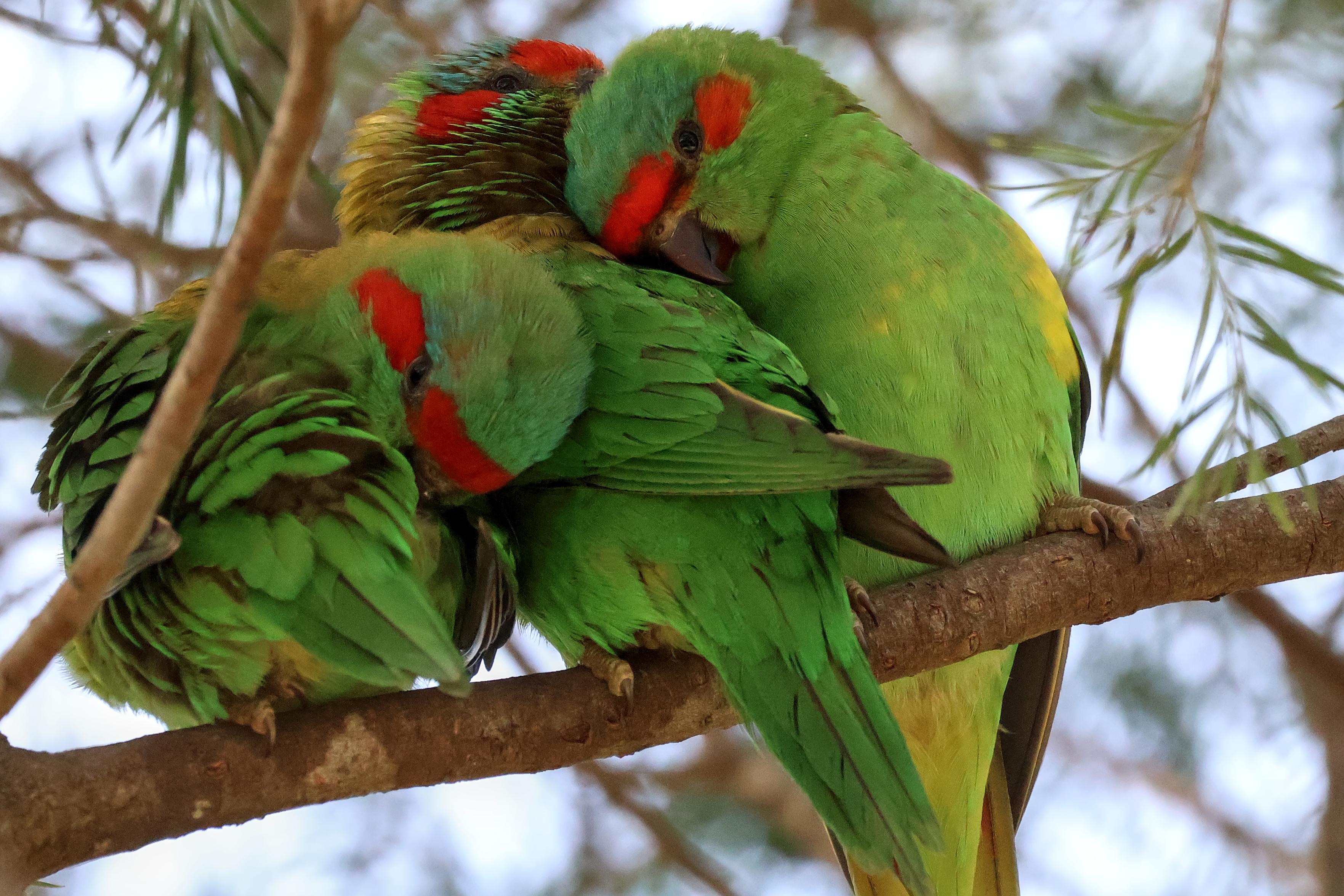 This happy little group of **Musk Lorikeets**, (*Trichoglossus concinnus*), was photographed in Tathra, NSW. Probably the best (bird) photo I captured in 2025. Thanks to all the kind folk on #mastodon who shared #camera info and tips. I'm very happy with the #canon #r10 and Rf100-400mm I used for this. Minimal editing in #darktable - which is also great.
