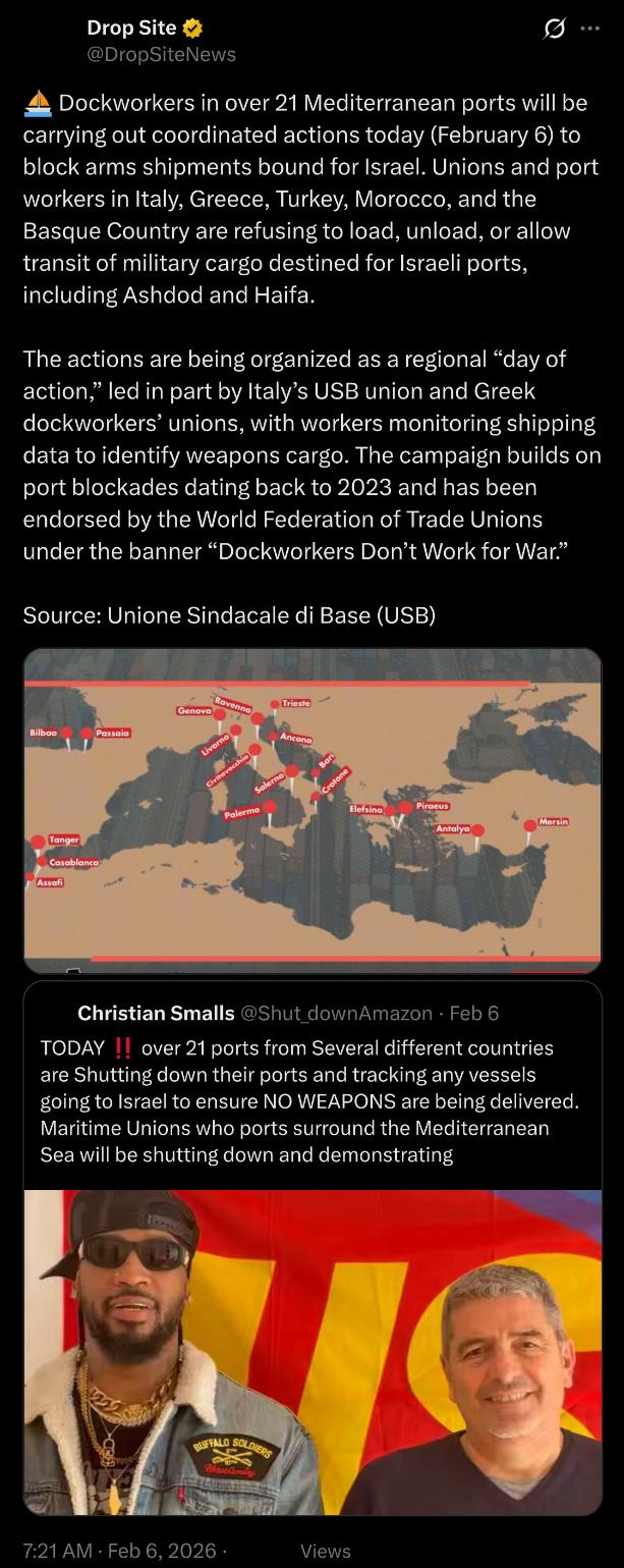 ⛵️ Dockworkers in over 21 Mediterranean ports will be carrying out coordinated actions today (February 6) to block arms shipments bound for Israel.