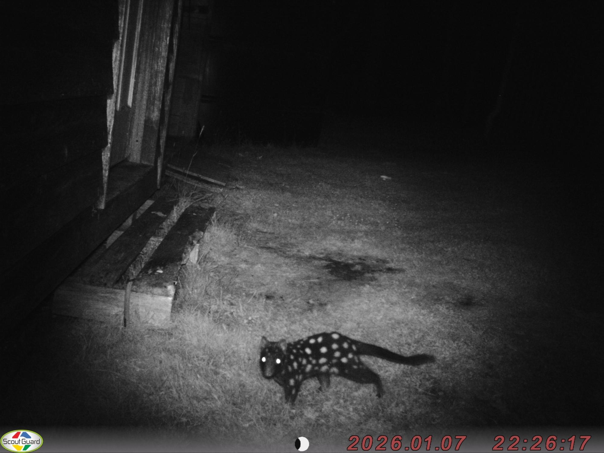 A night time camera trap image, showing part of a wooden building to the side, with an endangered Eastern Quoll to the front of the image. The quoll is looking at the camera, and has a dark fur with multiple white spots, with an all black tail.
