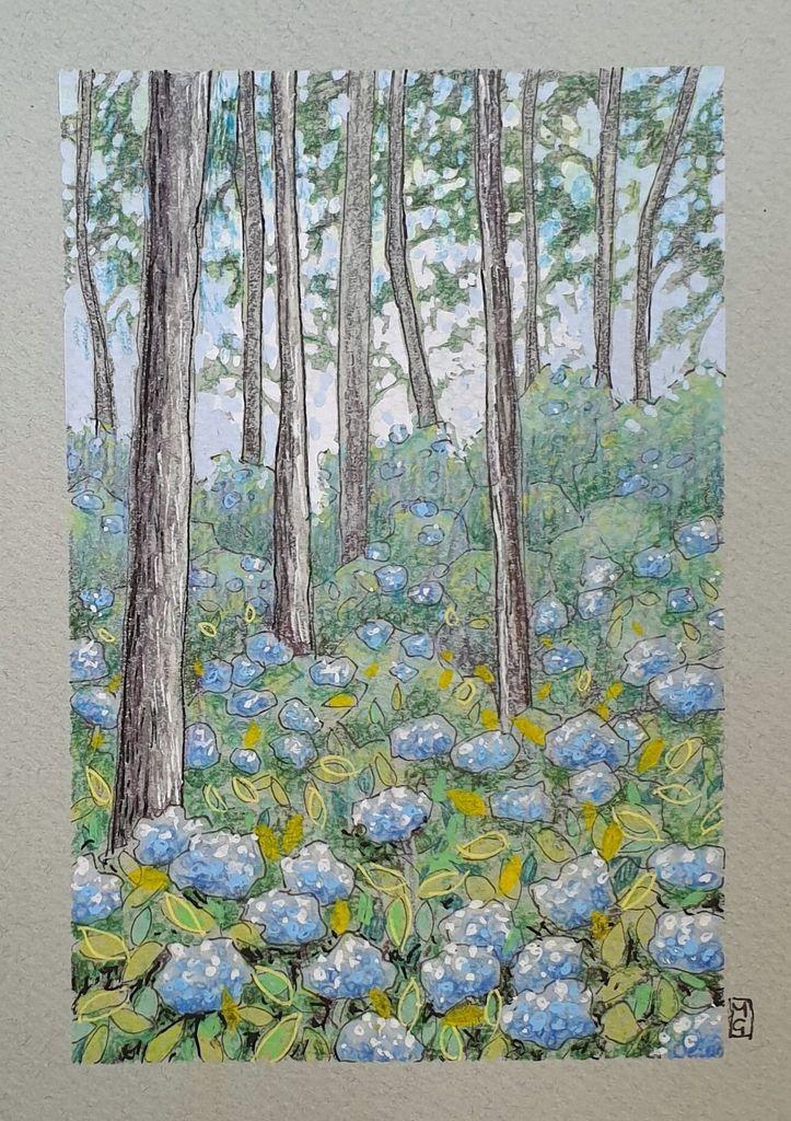 A new landscape in fresh greens and blues, A woodland with hydrangea. Available now from my Folksy shop...
