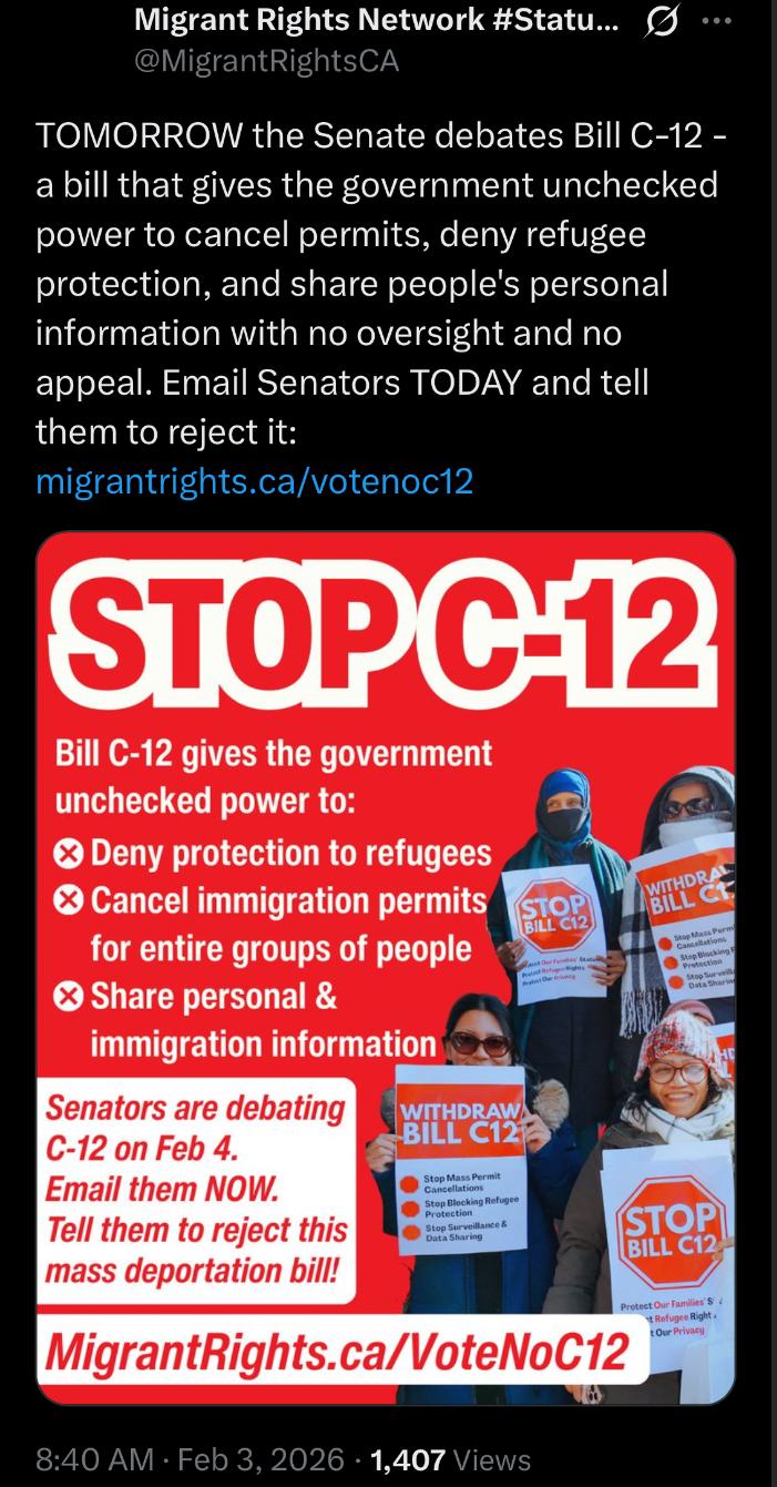 🇨🇦[2 DAYS AGO ] the Senate debates Bill C-12 - a bill that gives the government unchecked power to cancel permits, deny refugee protection, and share people's personal information with no oversight and no appeal.