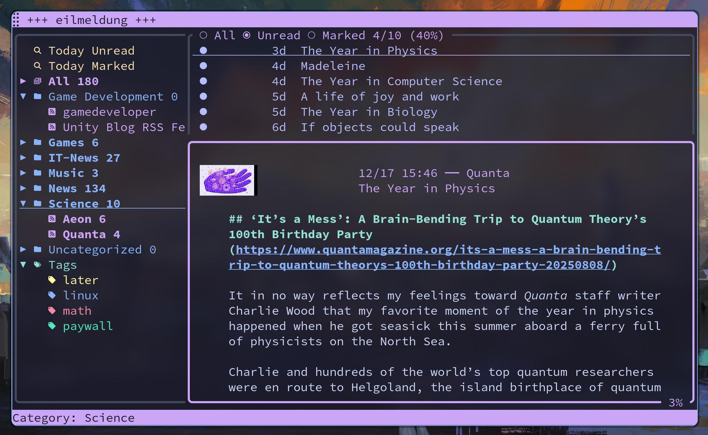 ⚡ **eilmeldung** — A fast & powerful TUI RSS reader.