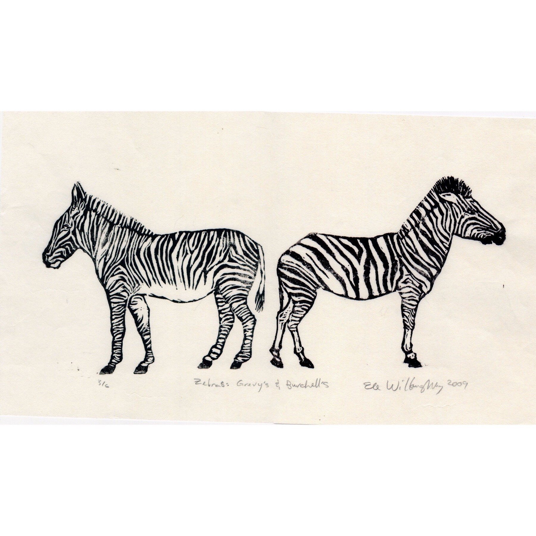 It’s International Zebra Day! Zebras are such an obvious temptation to the printmaker, considering how to depict life in black and white. They are inherently so graphic in their very skin. Though they aren’t striped any which way. This hand-pulled linoleum block print juxtaposes two varieties of zebra, Grévy’s (left) and Burchell’s, back to back.