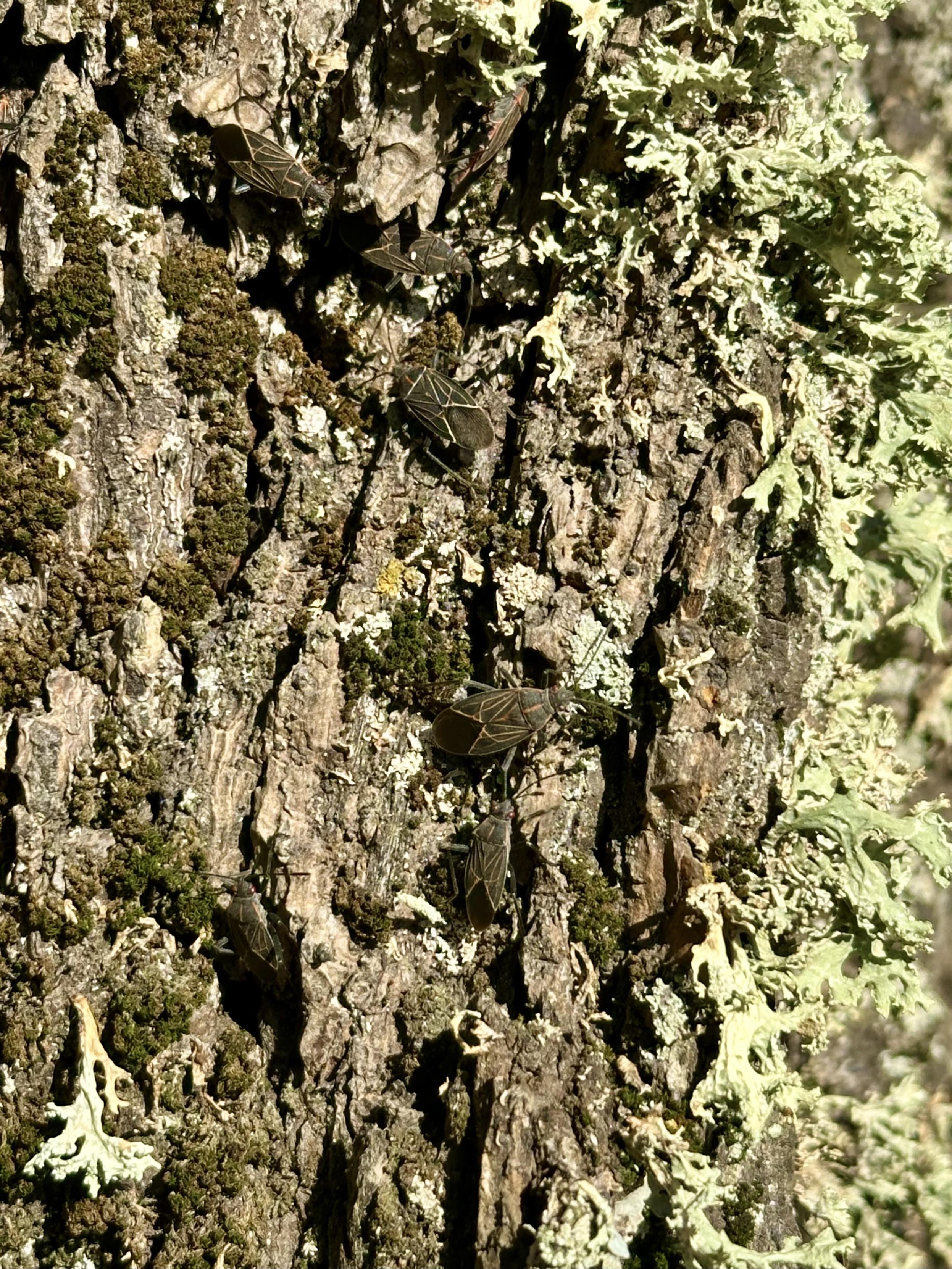 I went to get a closer look at the lichen on this big old fir, and noticed the bark was absolutely swarming with these insects. They don’t look like the bark beetles that I can find in a search; anyone know? The wing pattern is quite distinctive. #mosstodon #LichenSubscribe #entomology #bugstodon