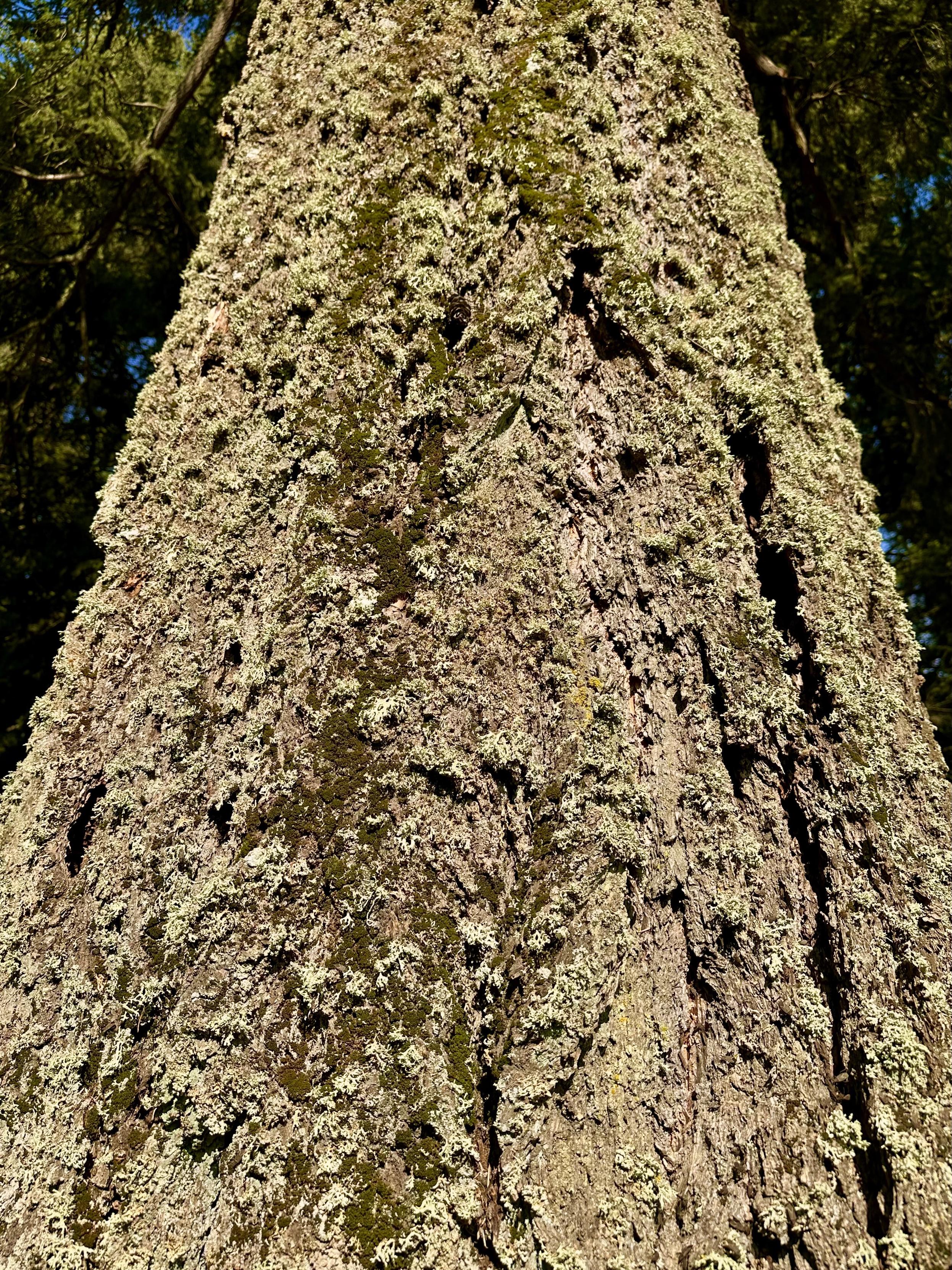 A tall, mighty, and very old fir tree with craggy bark, lots of pale lichen all over, and a streak of moss.