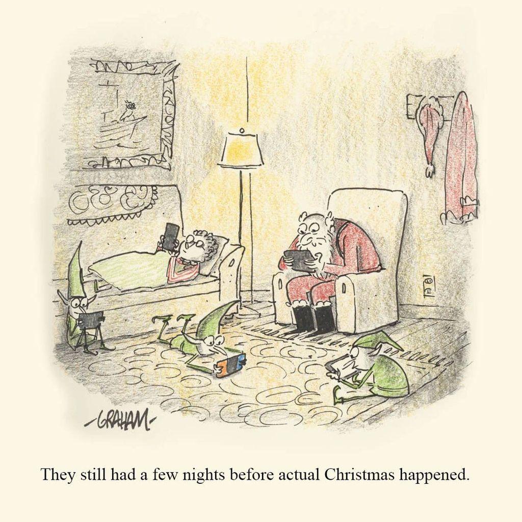 A cartoon illustration of Santa, Mrs. Claus, and three elves sitting in a living room playing video games on devices. Caption reads "They still had a few nights before actual Christmas happened."