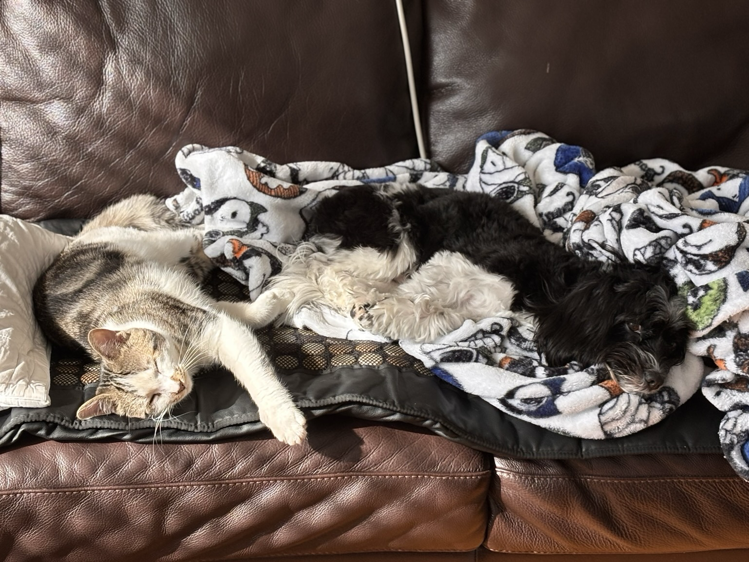 I came out into the living room and found Bill and Roy napping together! I think they love each other now. I was worried at first. What a relief! #dogsofmastodon #catsofmastodon