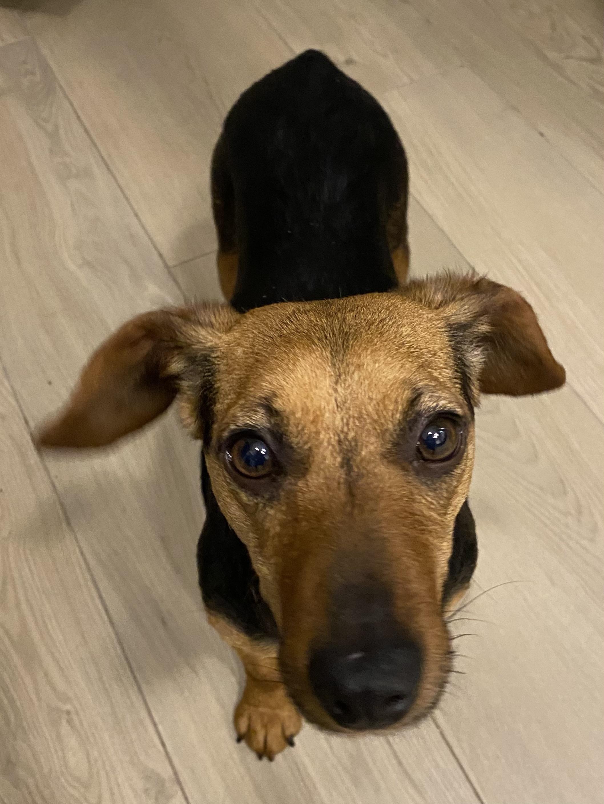 La foto Moncho de hoy es un perrito con la mirada llena de esperanza y amor (por el pollito) #fotoMoncho #DogsOfMastodon #DogsOfFedi