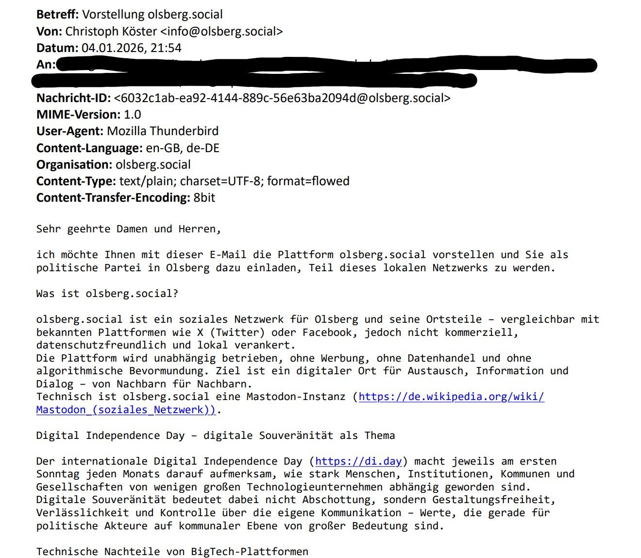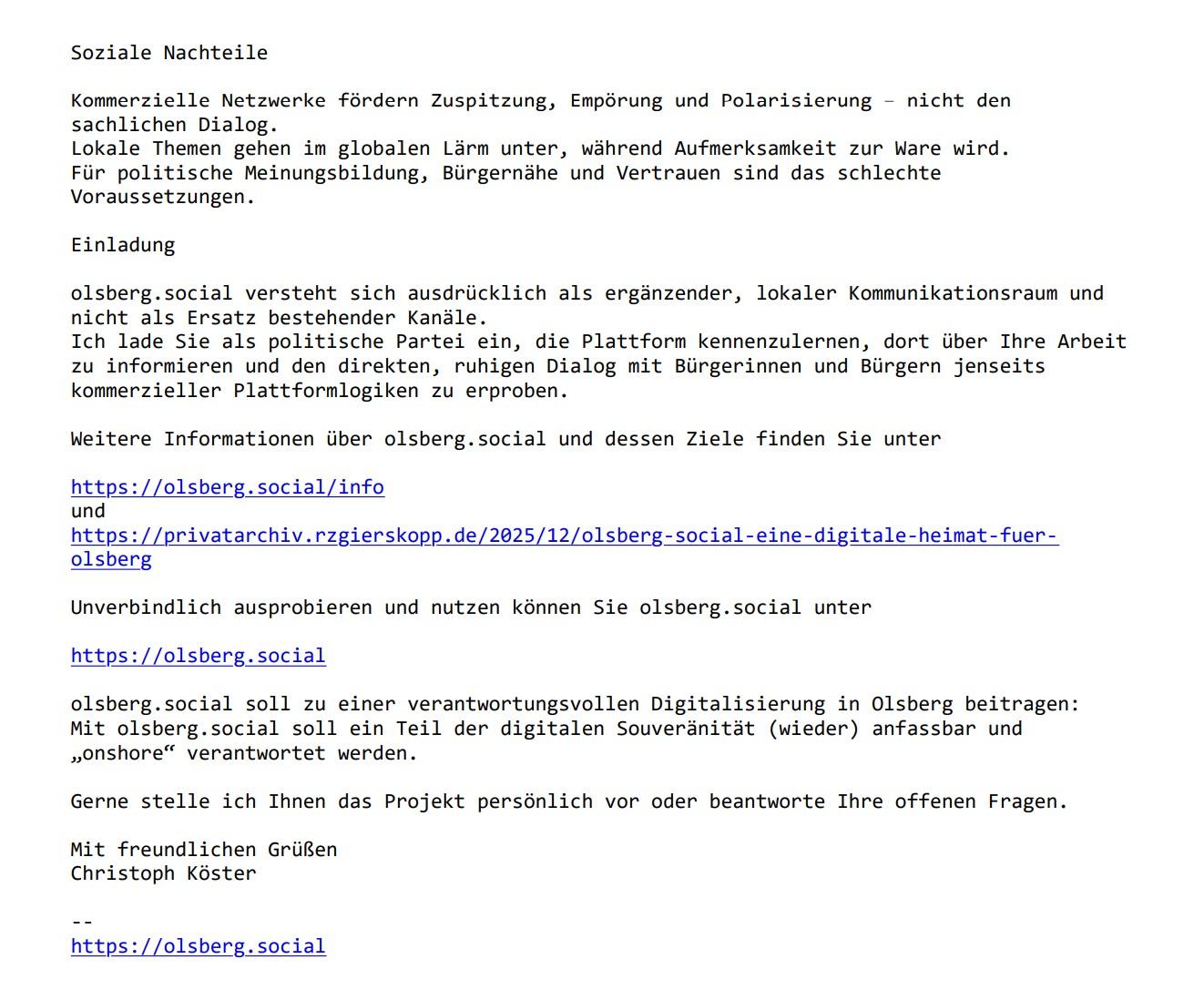 Diese Mail (siehe Bilder) habe ich soeben an die Parteien der Stadt Olsberg gesendet...