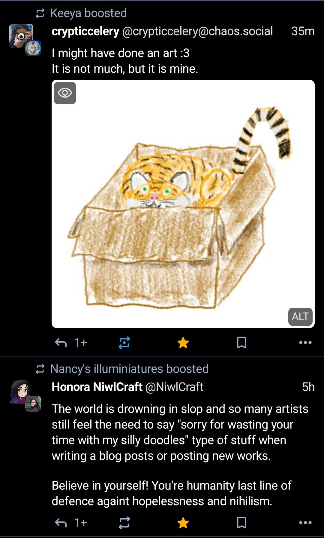 A screenshot from the Tusky app of two boosted posts. The first post, at the bottom of the screenshot, written by Honora NiwlCraft 5 hours ago & boosted by Nancy's illuminiatures a few minutes ago, is all text that reads "The world is drowning in slop and so many artists still feel the need to say 'sorry for wasting your time with my silly doodles' type of stuff when writing a blog post or posting new works. Believe in yourself! You're humanity's last line of defence against hopelessness and nihilism." The post immediately following that, by cryptic celery 35 minutes ago & boosted by Keeya mere moments ago, reads "I might have done an art :3 It is not much but it is mine." above what appears to be a hand-drawn pencil crayon depiction of a green-eyed orange tiger curled & crouching low within a large open-topped cardboard box, with its striped tail sticking out & over the edge of the box, wearing an extremely alert & excited expression as if watching a bird get closer to pouncing range. It's a super cute & charming drawing.