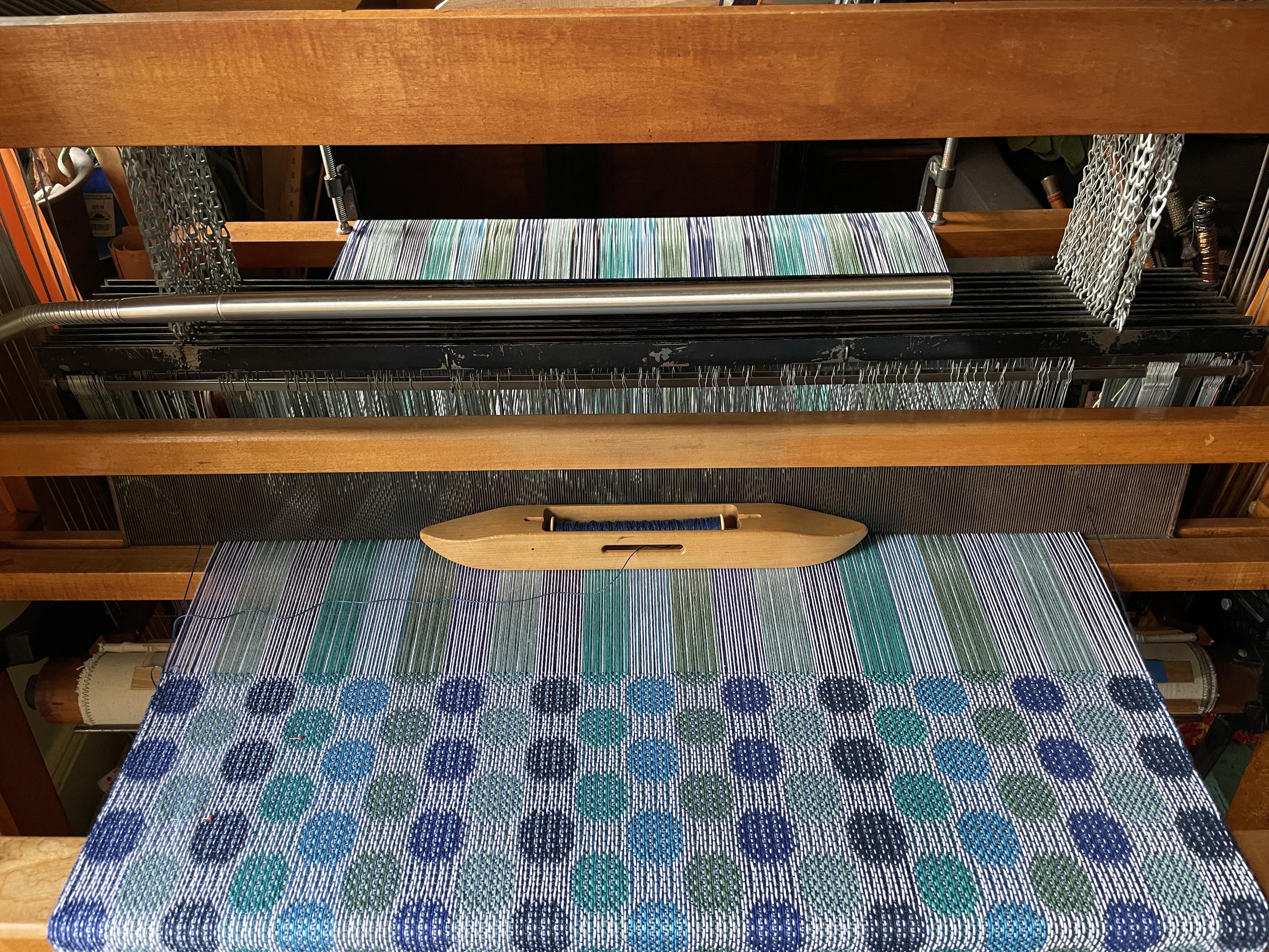 30 inches wide makes it a little slow going because it’s a bit awkward reaching that far. I’m using the big shuttle so I don’t have to wind bobbins so frequently. These will be bath towels to match the hand towels I made a few months ago.