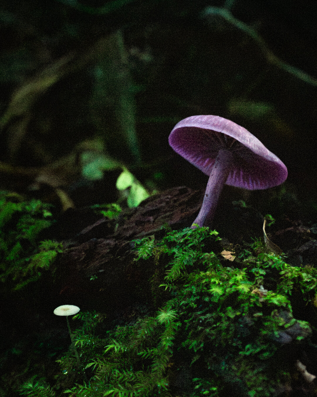 fotografia de natureza feita à noite mostrando um cogumelo roxo crescendo sobre um tronco caído no chão da floresta. O cogumelo é do estilo "guarda-chuva", de uma cor arroxeada bem vibrante que contrasta com os tons de verde das plantas e musgos ao seu redor. A composição com o pequeno tronco caído, o cogumelo e o chão repleto de plantinhas e até mesmo outros cogumelos menores fazem uma cena meio "conto de fadas"