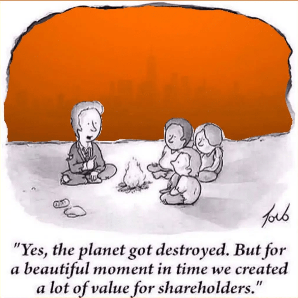 Drawing of a person with three children sitting around a bonfire in the desert. Caption: "Yes, the planet got destroyed. But for a beautiful moment in time we created a lot of value for shareholders."