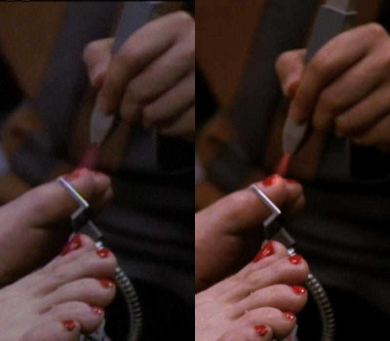 Warning: highly detail-obsessed observation: In the original version of #StarTrekTNG's "The Host"⬅️, the small device applies nail polish to Beverly's left big toe and second toe simultaneously. In the remastered version ➡️, her second toe is already red and only the big toe is painted. I warned ya! 😅