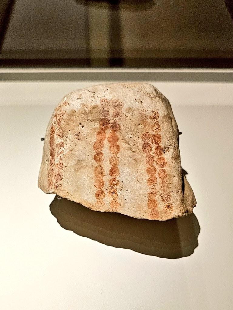 A 15,000-year-old painted limestone, from the Hohle Fels Cave, Swabian Jura. The shapes of the dots are symmetrical and executed precisely. The accuracy indicates that the dot rows were painted using a tool or stamp. On display at our branch museum urmu, Blaubeuren