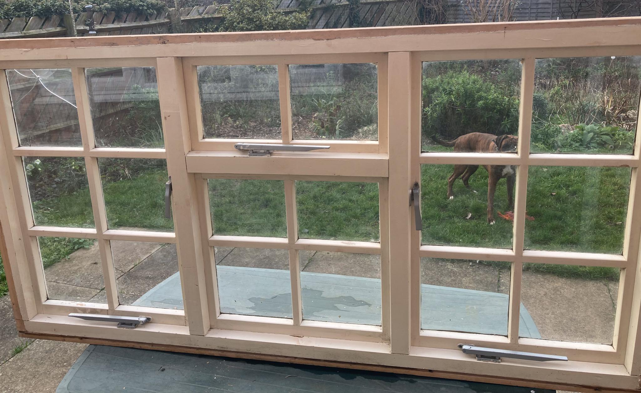 A window sits on a green garden table in a back garden. The window has three wood framed panels each containing six small glass panes. It has casement openings at each side and a centre top casement in the middle section. The top left glass pane is cracked. Seen through the right window panel a brindle boxer dog is standing on a small grassed area with a small orange toy at his feet.