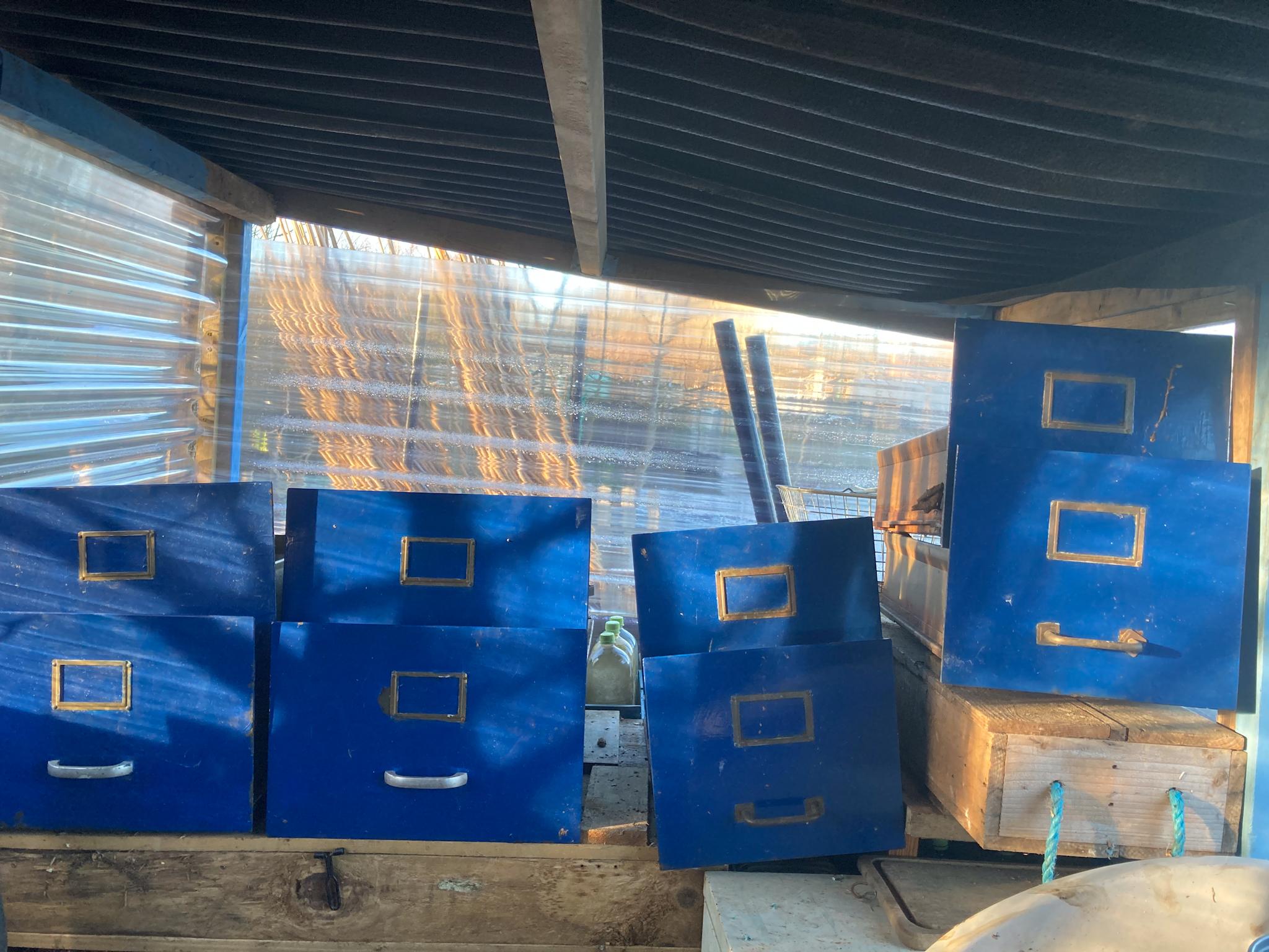 Beside a compost bay covered in hessian is a large rectangular wooden crate. It stands above the ground on six wooden feet, three on each side.  Winter sunlight is above a blue shed surrounded with water butts. Three transparent corrugated roof sections provide makeshift shed windows.
