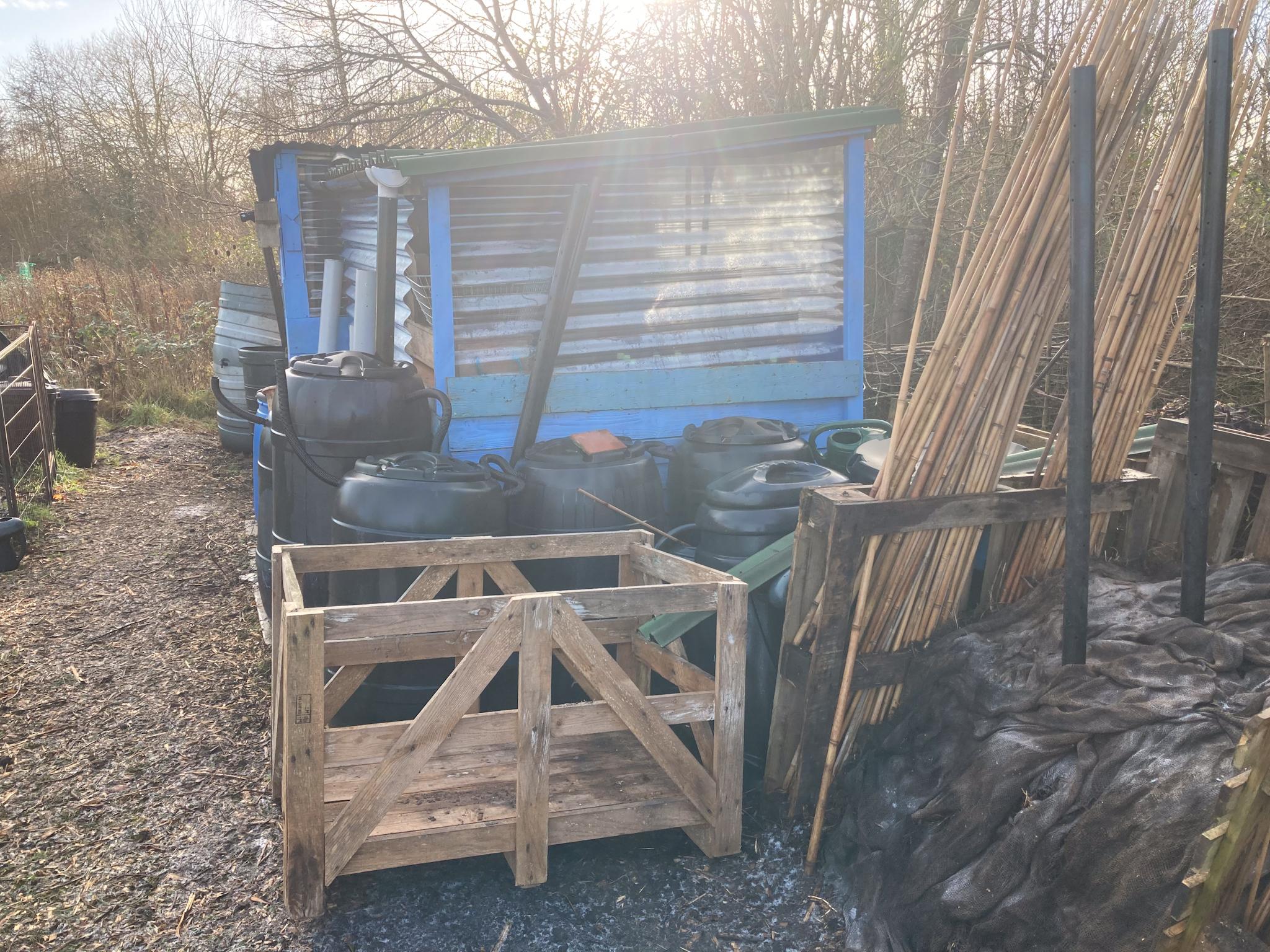 Beside a compost bay covered in hessian is a large rectangular wooden crate. It stands above the ground on six wooden feet, three on each side. Winter sunlight is above a blue shed surrounded with water butts. Three transparent corrugated roof sections provide makeshift shed windows.