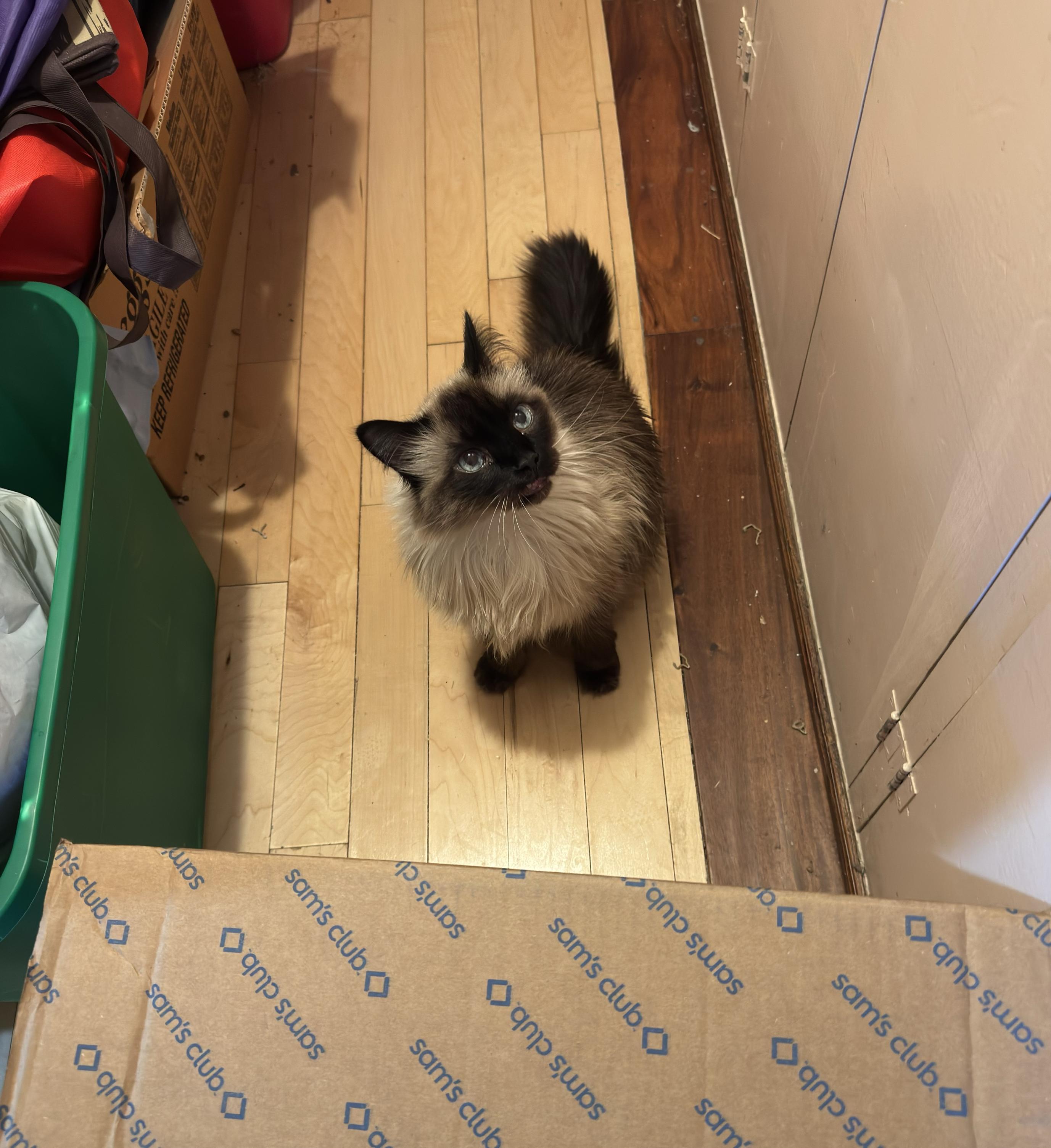 If for some reason you need to stop a most handsome Murphy from getting in somewhere, put a box filled with 30 pounds of peanuts in his way. It is apparently an insurmountable barrier for him. #cat #cats #Caturday #CatsOfMastodon #catstodon #MastoCats #CatsOfFediverse #PetsOfMastodon #SiameseCat