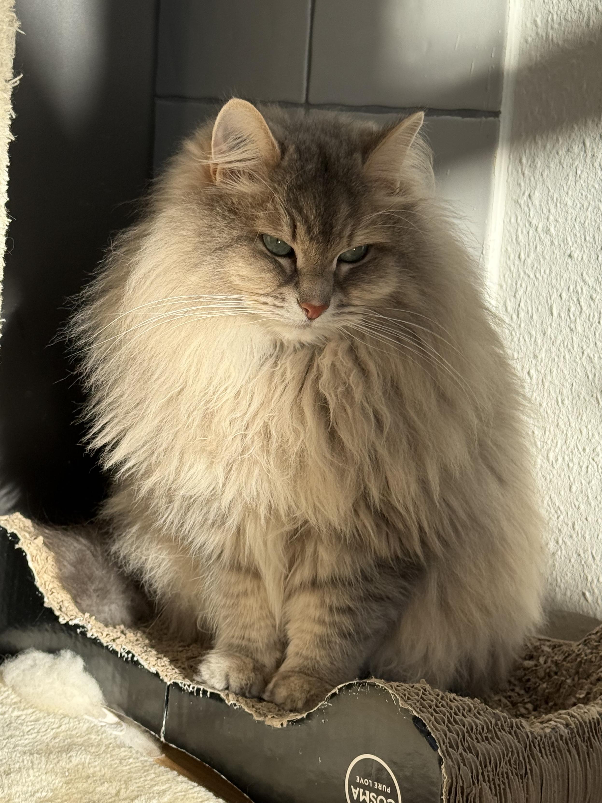 Closeup of a grey Siberian cat (Knold) sitting on a well-worn cardboard scratching pad, looking towards the camera. He is very fluffy, especially his large mane. His long white whiskers are very prominent.