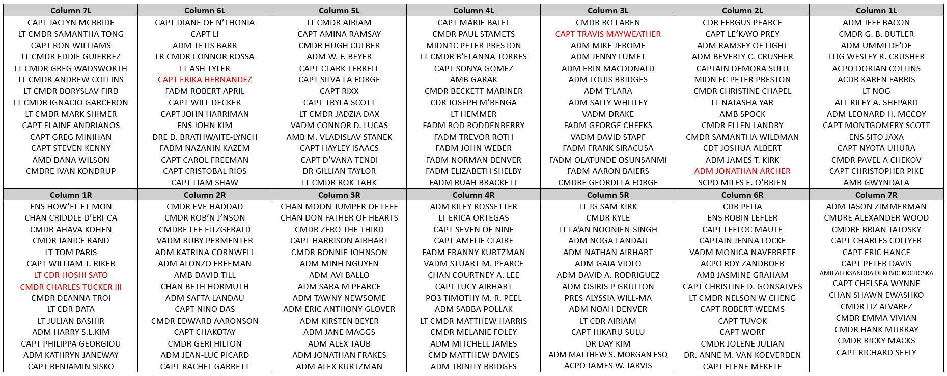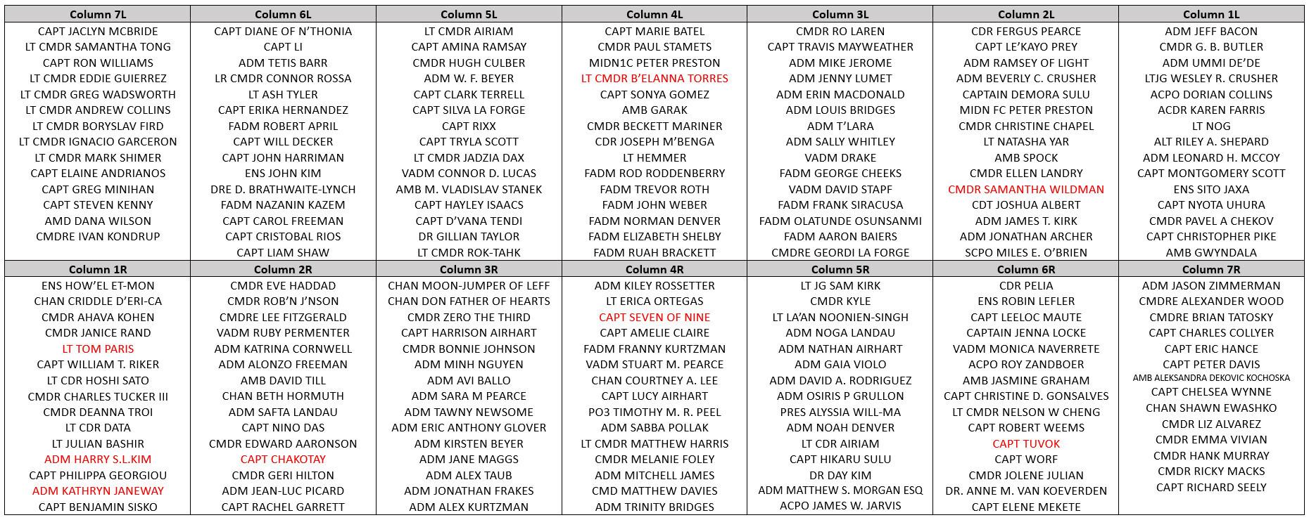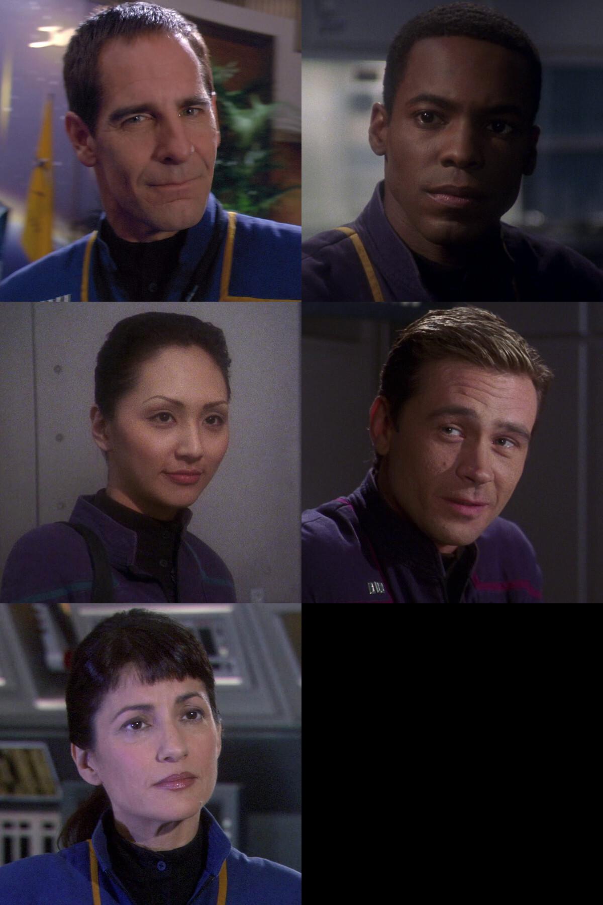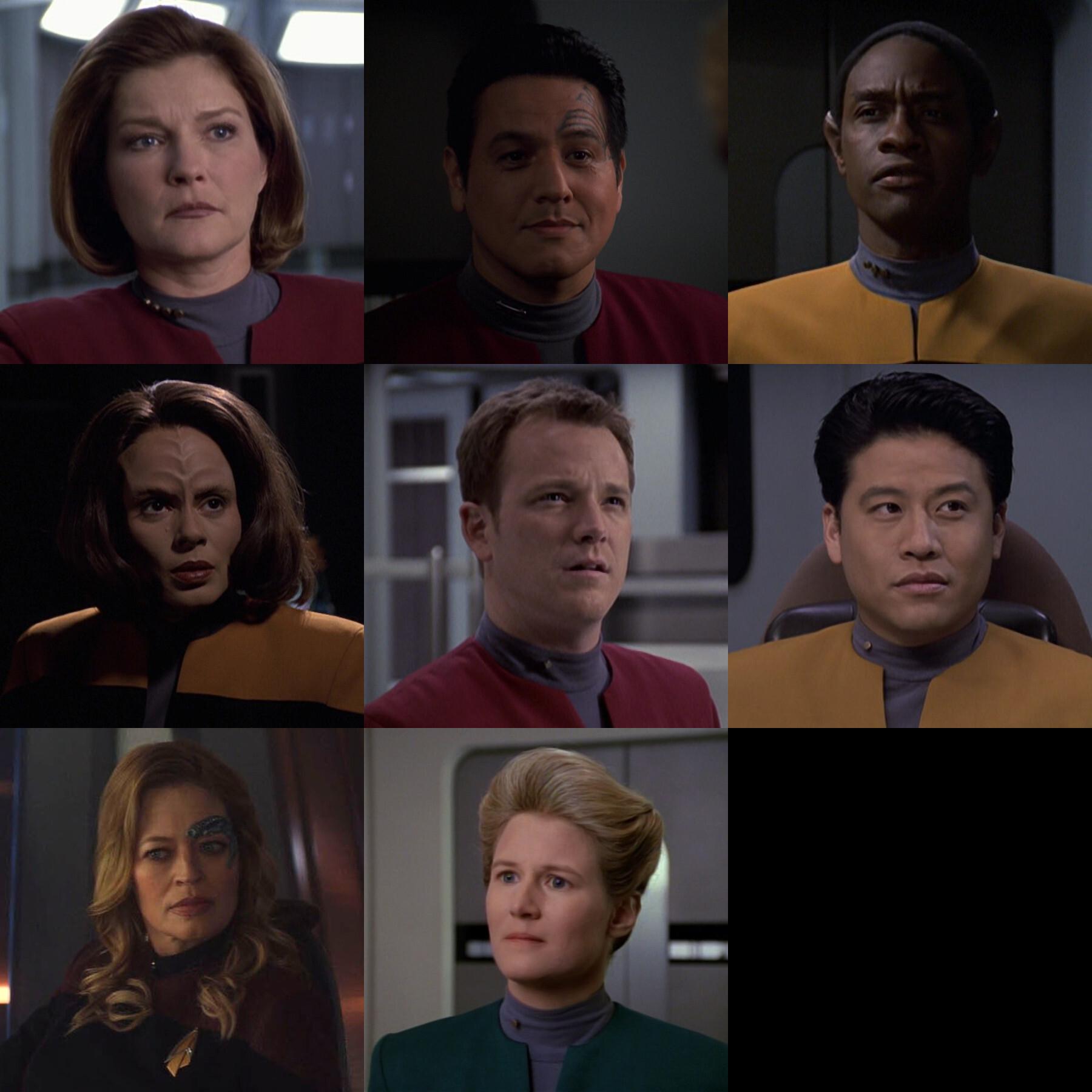 From #StarTrekVOY, we have the complete Starfleet main cast members (minus the Doctor) plus Seven of Nine (only listed here and not at #PIC) and Samantha Wildman. From #StarTrekENT, we have the Starfleet characters Archer, Tucker, Sato, Mayweather (no Malcolm Reed) and Captain Erika Hernandez. 4/8