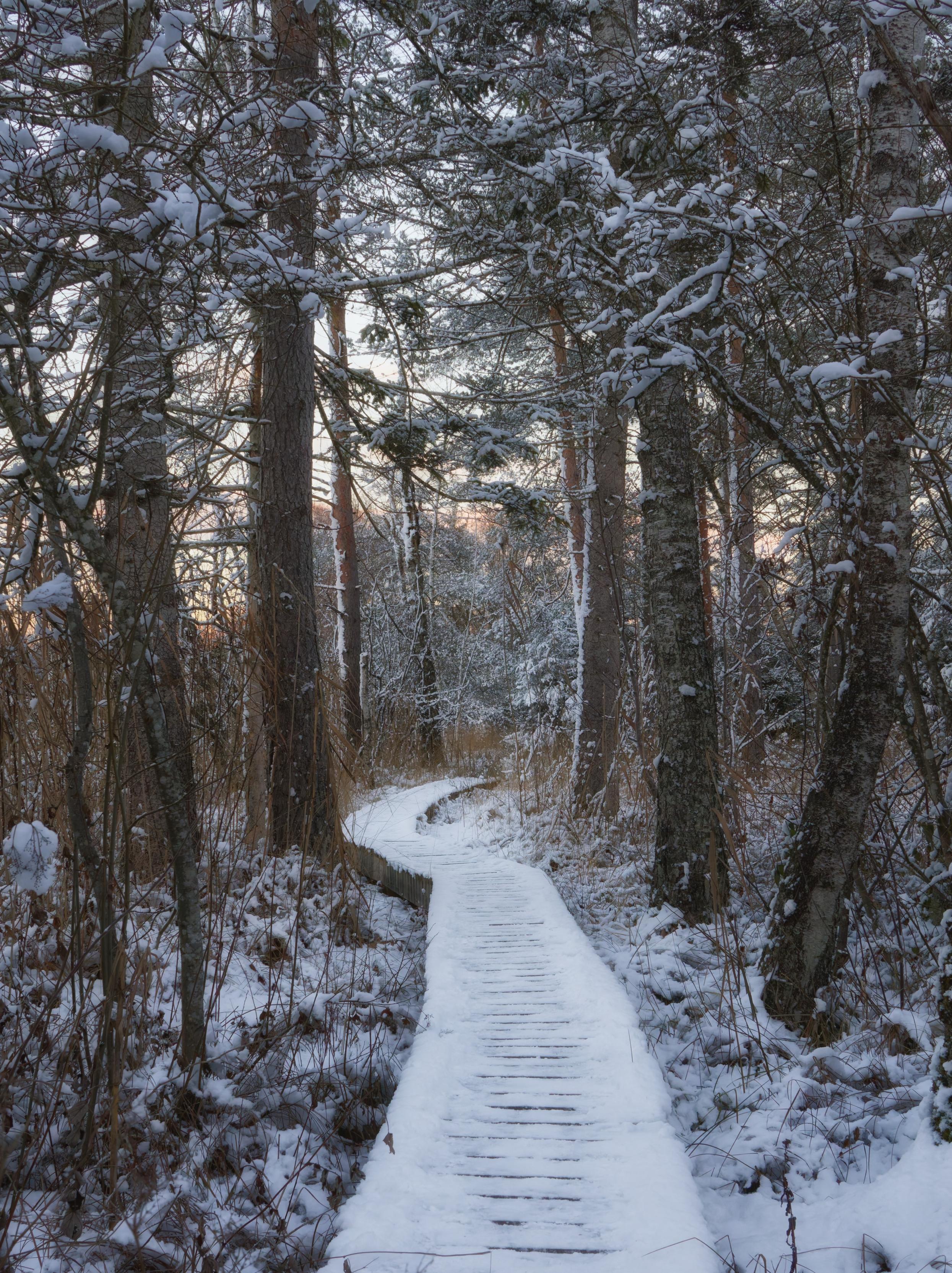 This serene winter landscape photograph features frost-covered trees emerging from dense ground fog along a rural path. The focal point is a majestic tree, fully laden with frost, with intricate white crystalline formations covering every branch and twig. This creates a delicate, lace-like appearance against the brilliant blue sky. The tree's structure is clearly visible through the hoarfrost, with its branching pattern extending gracefully upwards and outwards. A thick layer of white fog covers the lower part of the scene, creating a dreamlike atmosphere and partially obscuring the tree trunks and surrounding vegetation. Additional frost-covered trees flank both sides of the composition, with their white-coated branches visible through varying degrees of fog density.