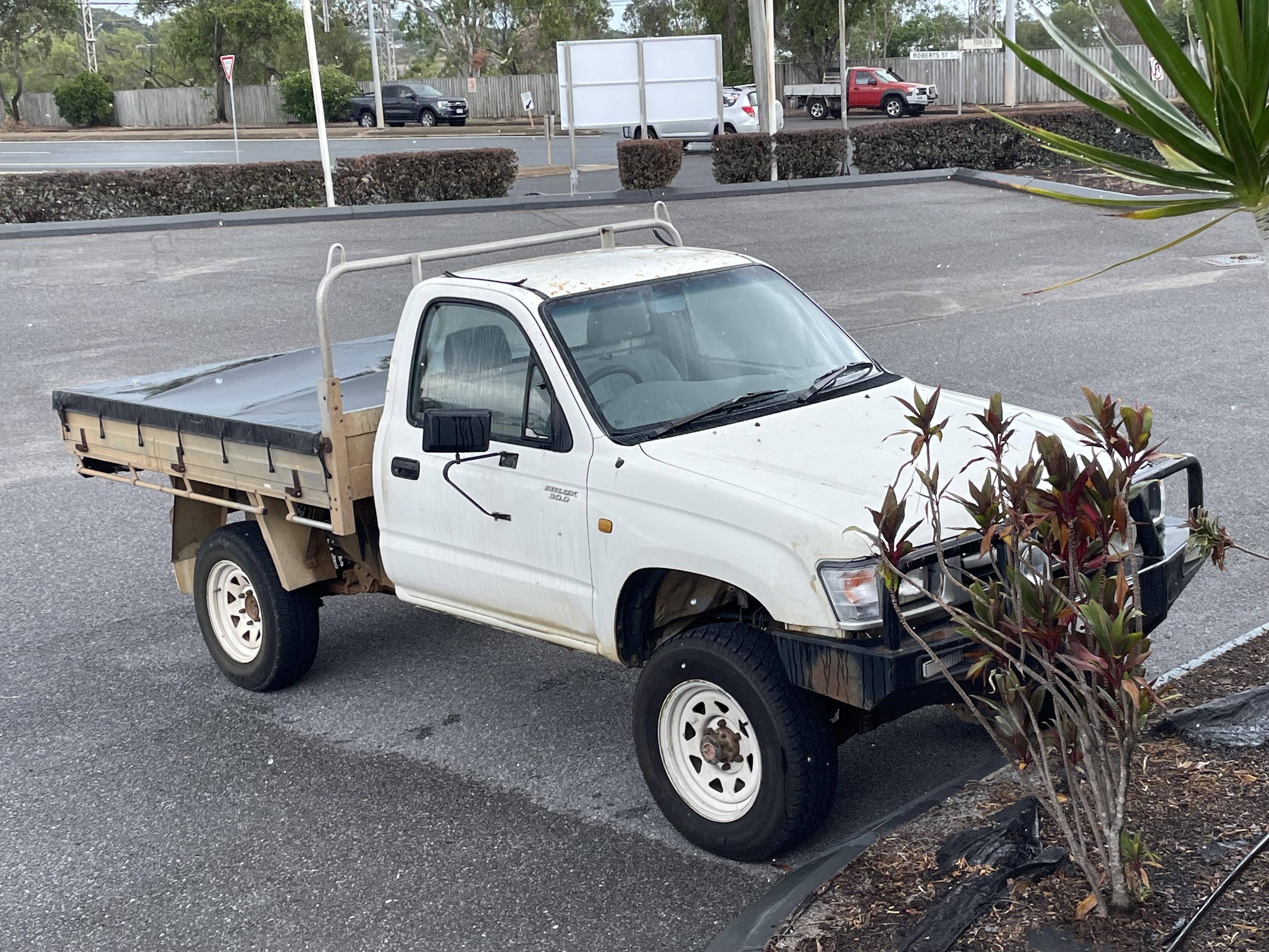 A white Toyota Hilux trayback ute in a wet carpark getting rained on.