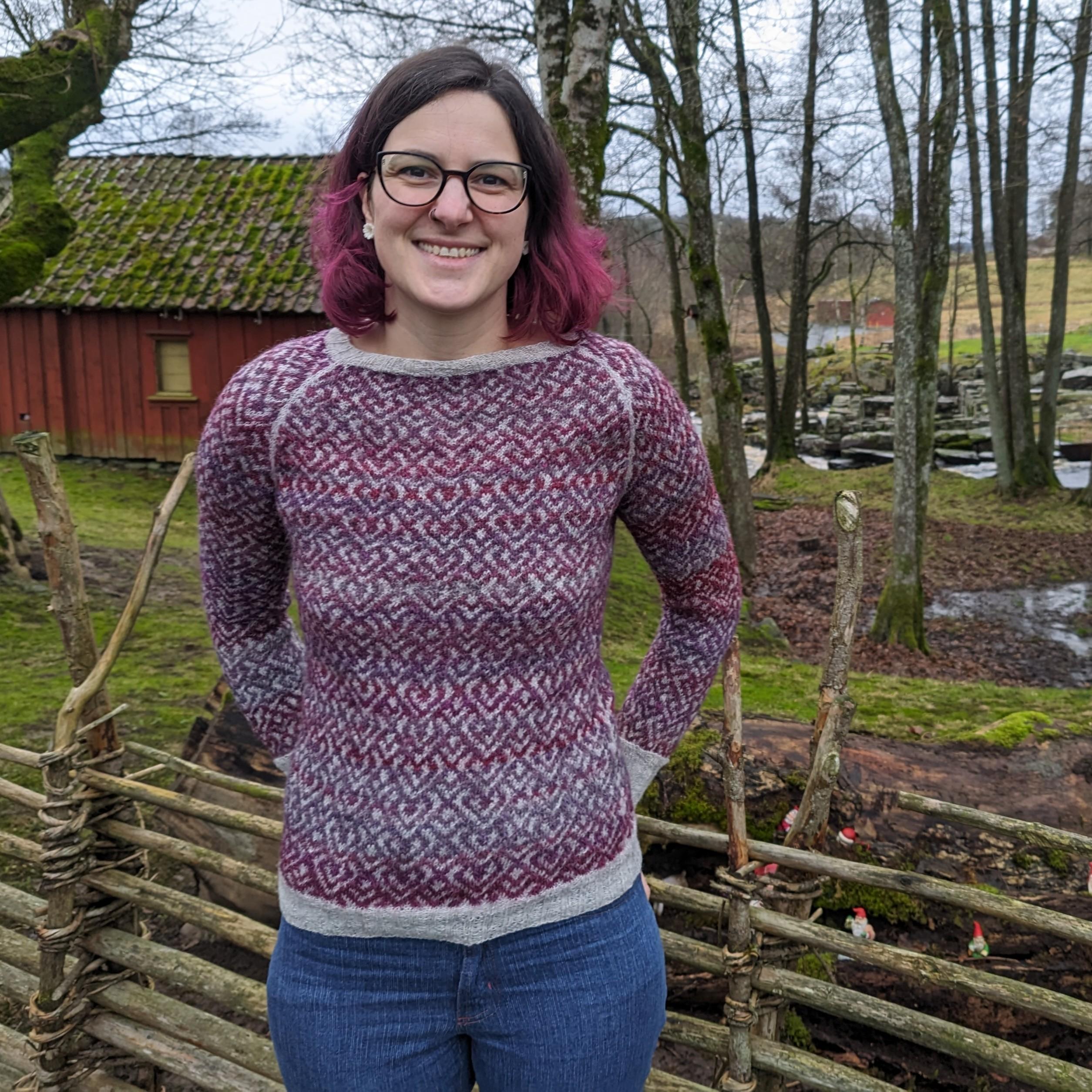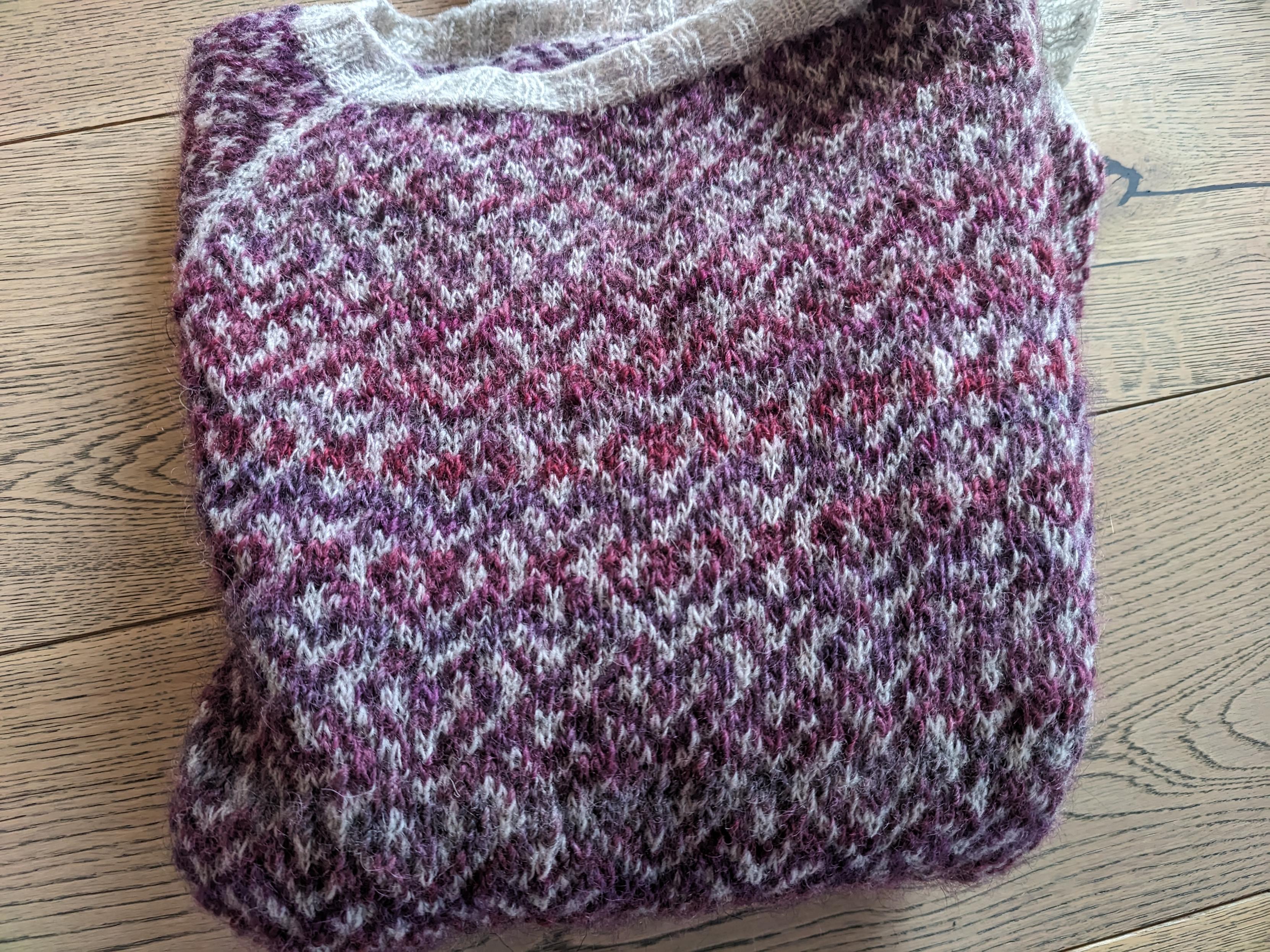 Here is my newest knitted sweater. I spun the purple yarn (100% Marsham sheep fibre, dyed by an indie dyer, 1-ply) and bought the grey (Kampes 1 trådigt ullgarn).