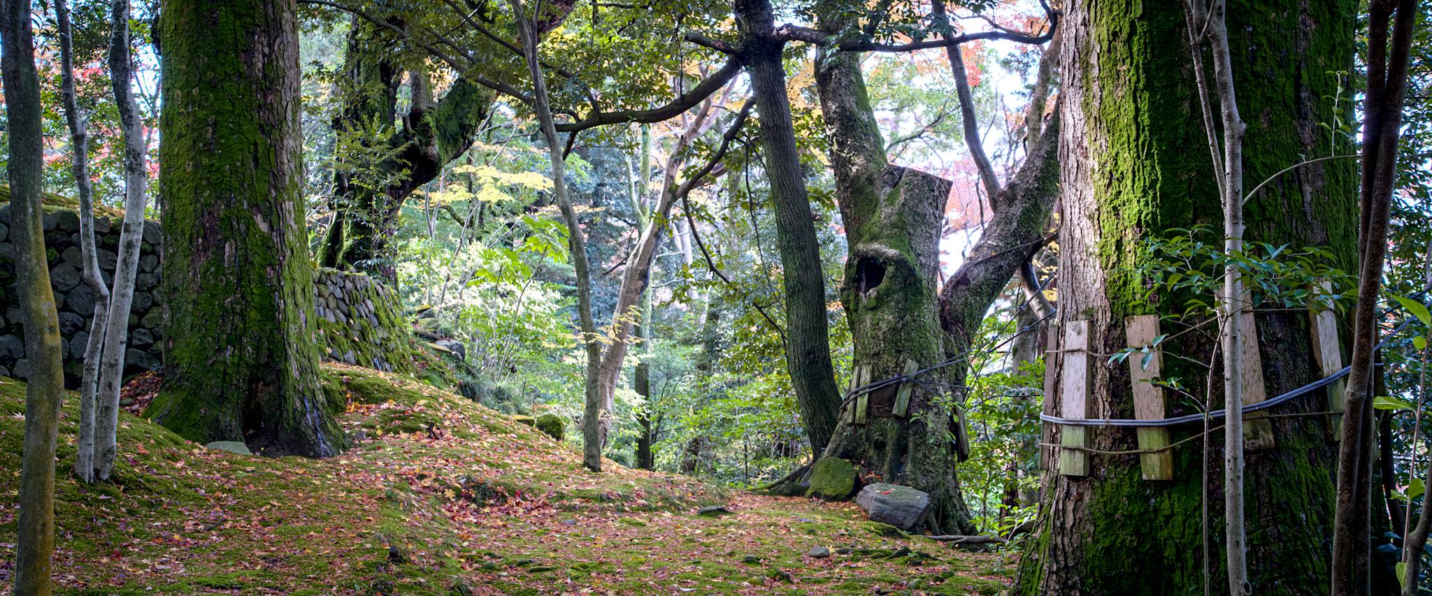 Anamorphic panoramic photo of the trees in Kenrokuen Garden, Kanazawa.