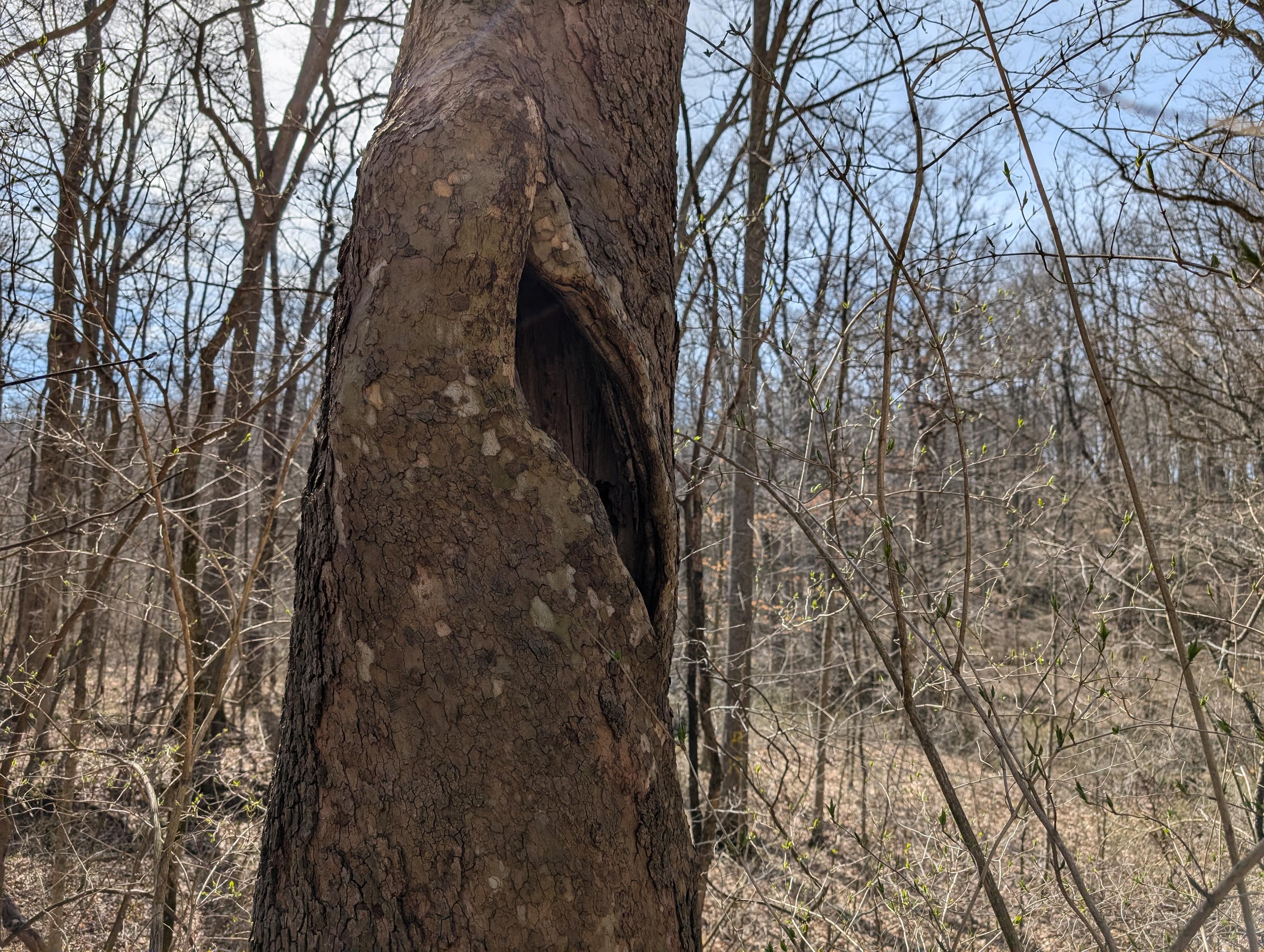 A large sycamore tree set against a background of smaller trees, and a pale blue spring sky. A big diagonal gash is slowly healing, showing it to be an old injury. The hollow interior common to these trees can be seen